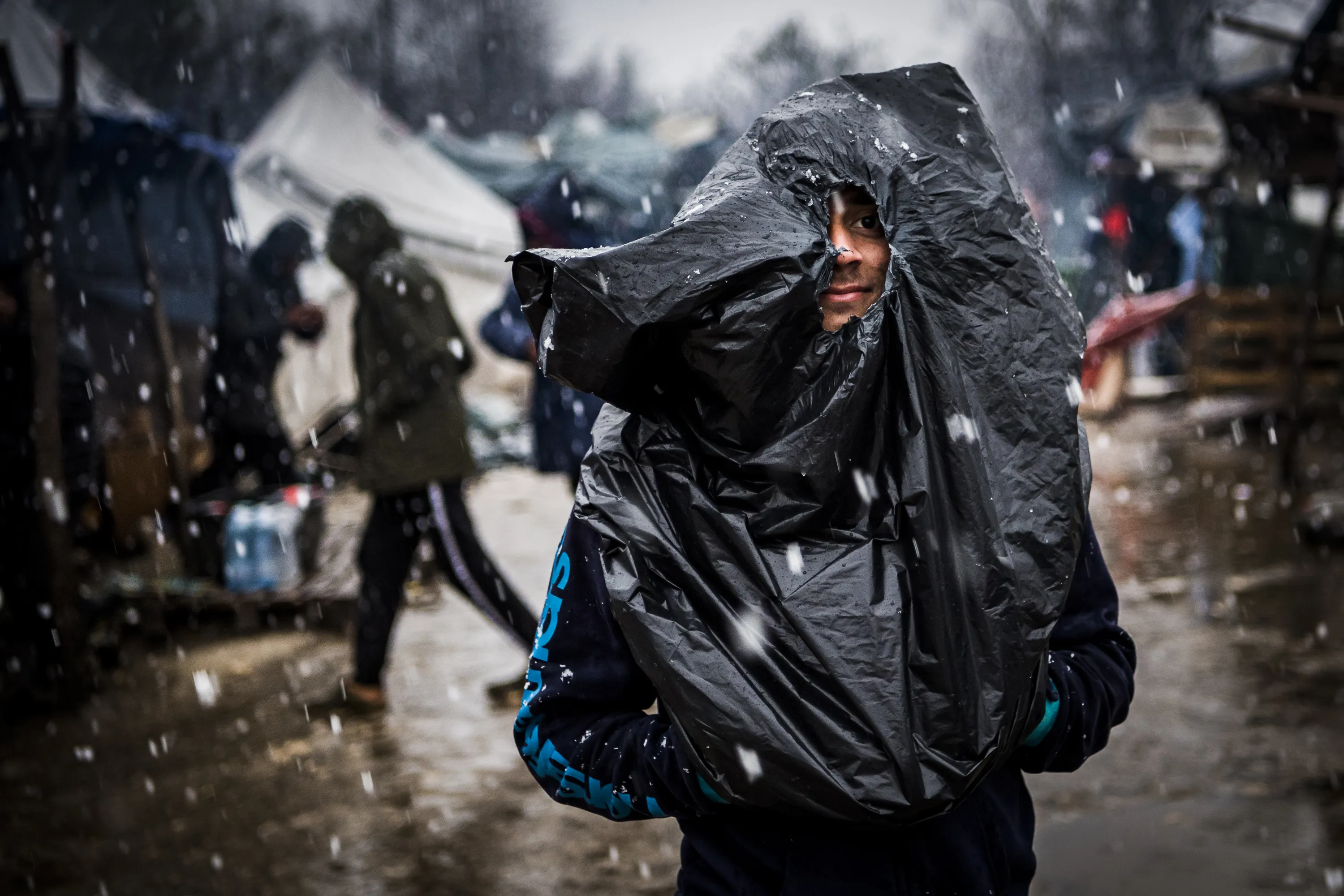 A migrant walks covered with a plastic bag at the Vucjak refugee camp outside Bihac, Bosnia and Herzegovina, 02 December 2019 (issued 03 December 2019. According to local media, hundreds of people remain at the camp even after International officials called for it to be shut down. (Photo by Jean-Christophe Bott/EPA/EFE)