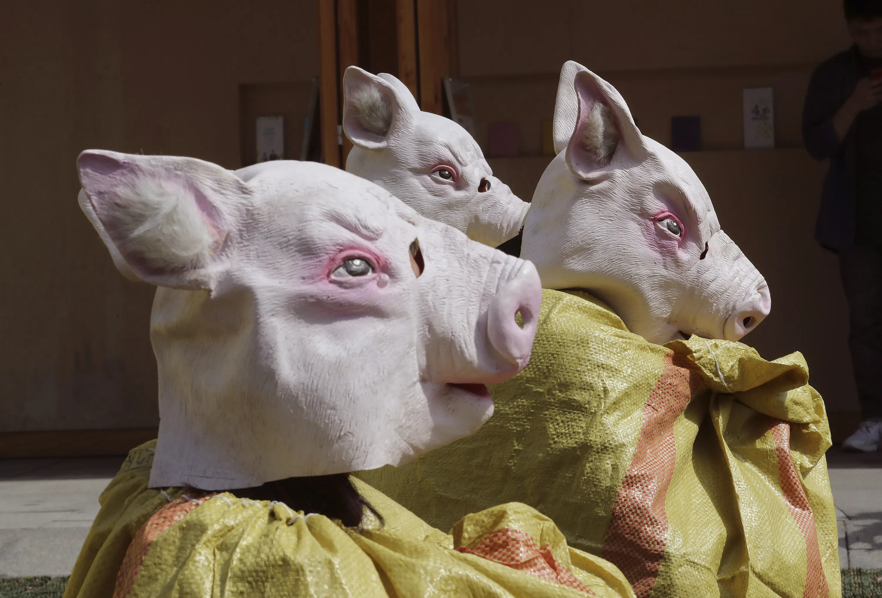 Animal right activists wearing pig masks stage a memorial rally for those slaughtered due to African swine fever in Seoul, South Korea, Thursday, September 26, 2019. South Korea on Wednesday said it was intensifying efforts to clean farms around the country as it scrambles to contain the spread of the highly contagious African swine fever that has ravaged farms near its border with North Korea. (Photo by Ahn Young-joon/AP Photo)