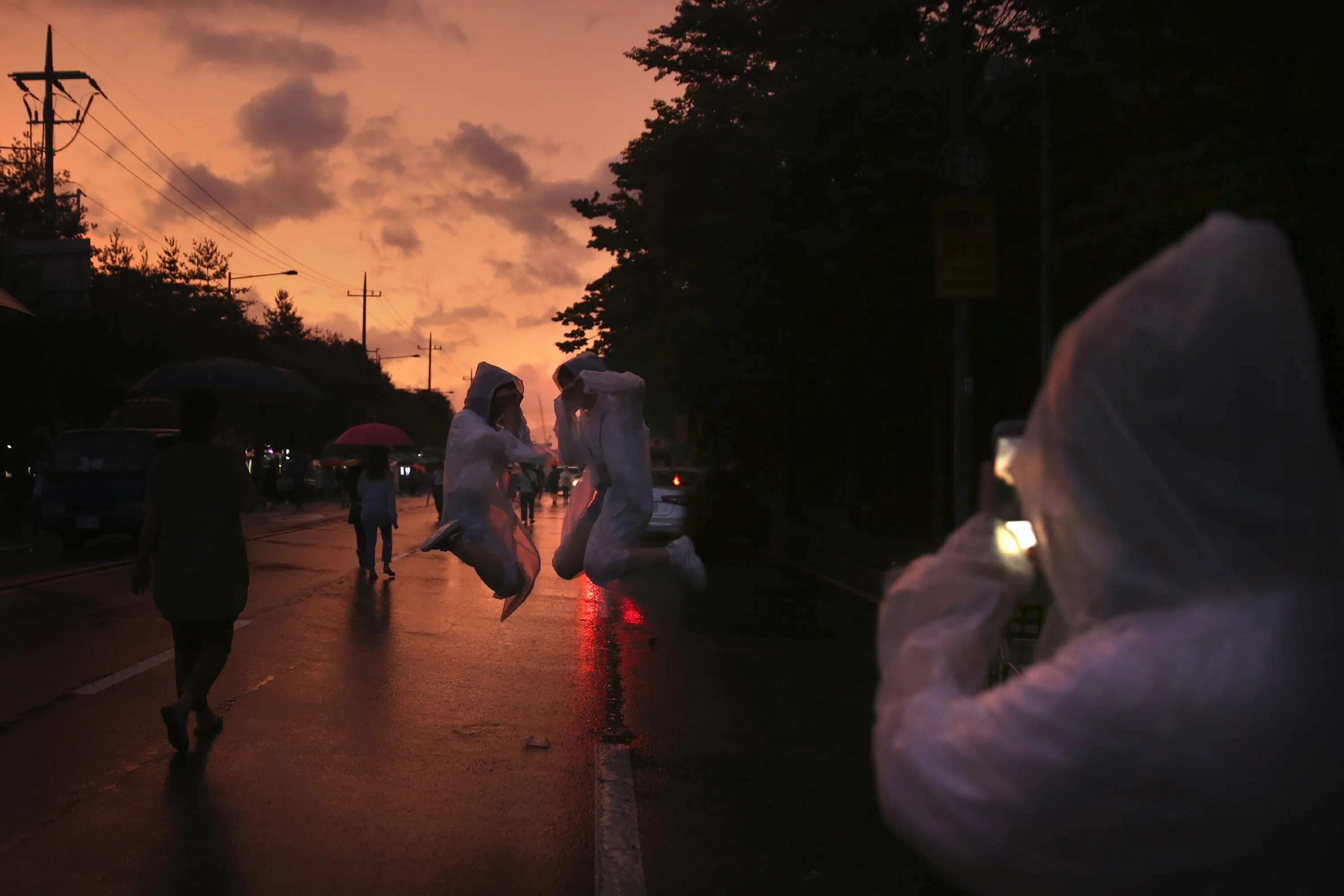 Girls leap as they pose for a photo at a street festival in Gwangju, South Korea, Friday, July 19, 2019. Thousands of athletes from around the world have converged on Gwangju as it hosts the World Swimming Championships through July 28. (Photo by Mark Schiefelbein/AP Photo)