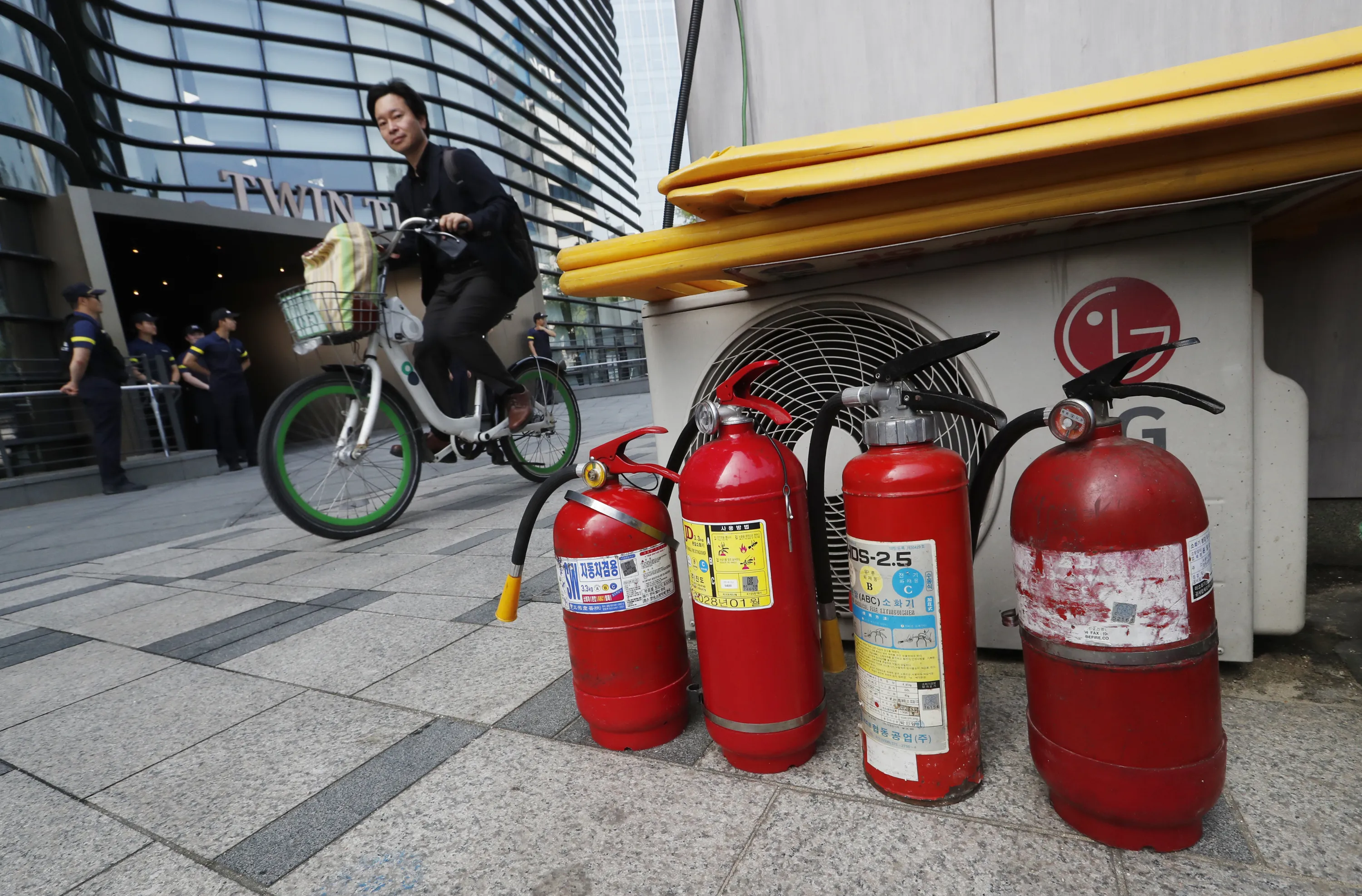 Fire extinguishers are placed near a building where the Japanese embassy is located in Seoul, South Korea, Friday, July 19, 2019. South Korean police say a man has set himself on fire in front of the Japanese Embassy in Seoul amid rising trade disputes between Seoul and Tokyo. (Photo by Ahn Young-joon/AP Photo)