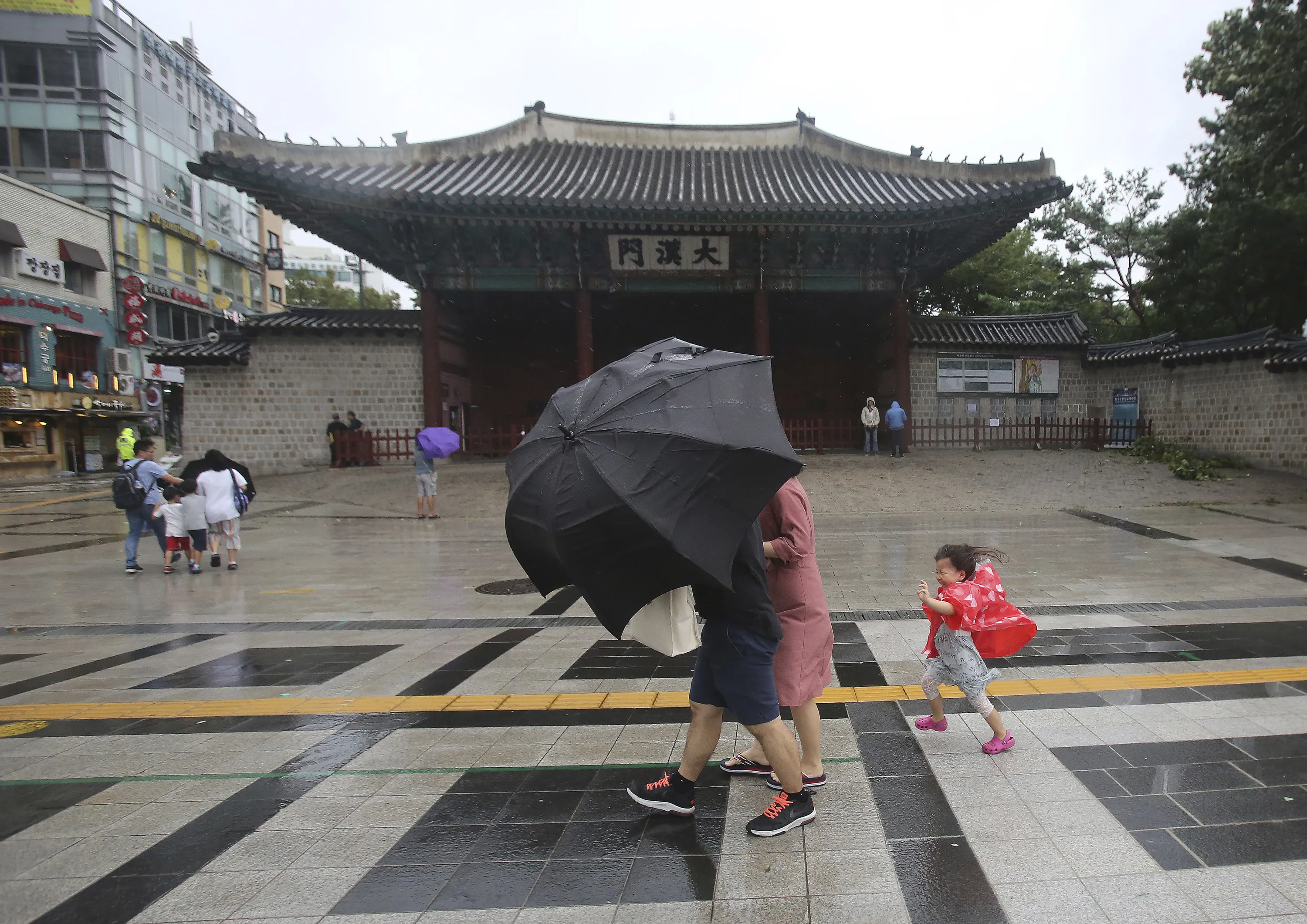 A family braves the strong wind and rain caused by Typhoon Lingling in Seoul, South Korea, Saturday, September 7, 2019. A typhoon passed along South Korea's coast Saturday, toppling trees, grounding planes and causing at least two deaths before the storm system made landfall in North Korea. (Photo by Ahn Young-joon/AP Photo)