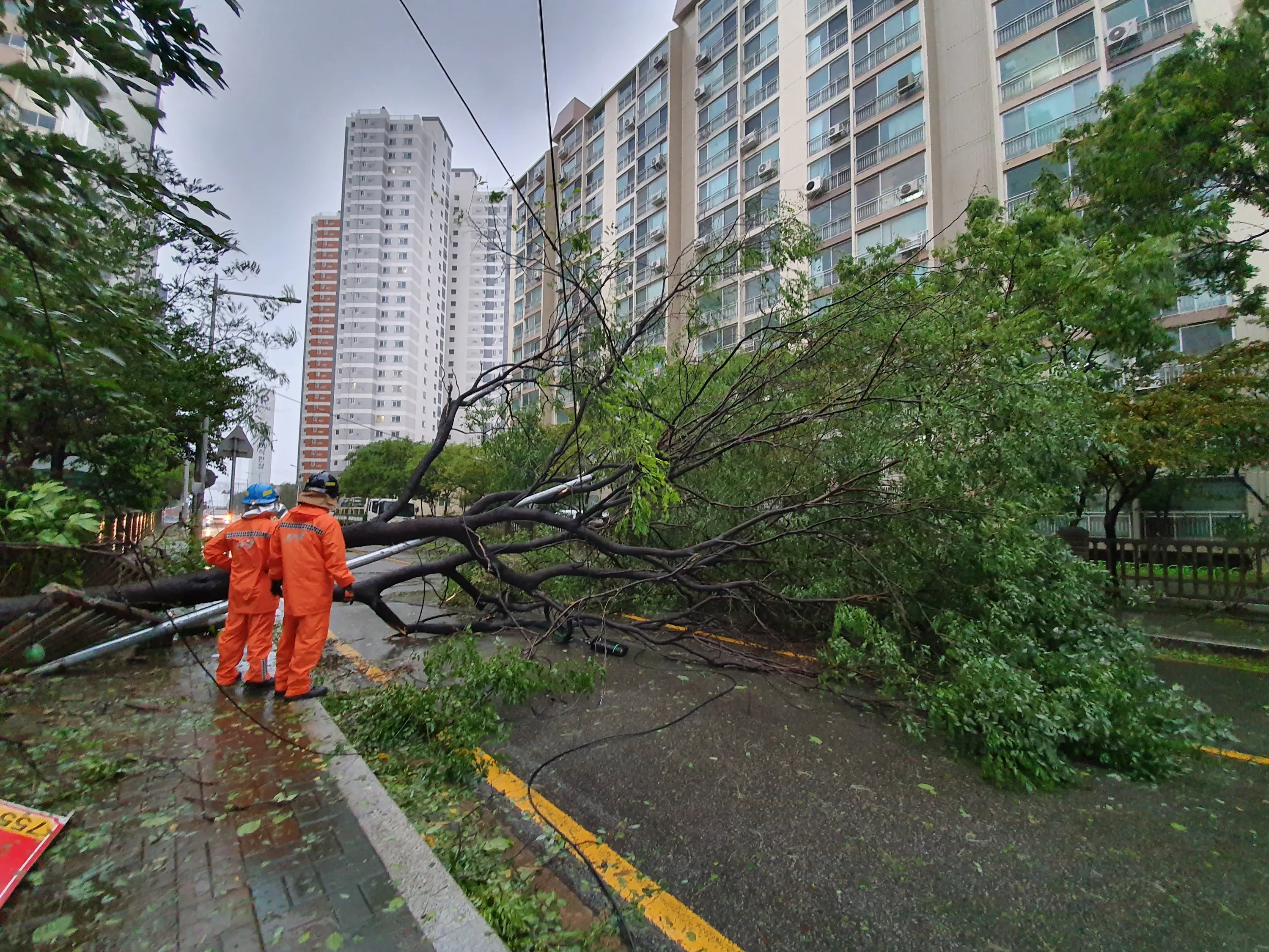 In this September 22, 2019, photo, traffic road is blocked by trees as typhoon Tapah approaches in Busan, South Korea. A powerful typhoon battered southern South Korea, injuring 26 people and knocking out power to about 27,790 houses, officials said Monday. (Photo by Cha Keun-ho/Yonhap via AP Photo)
