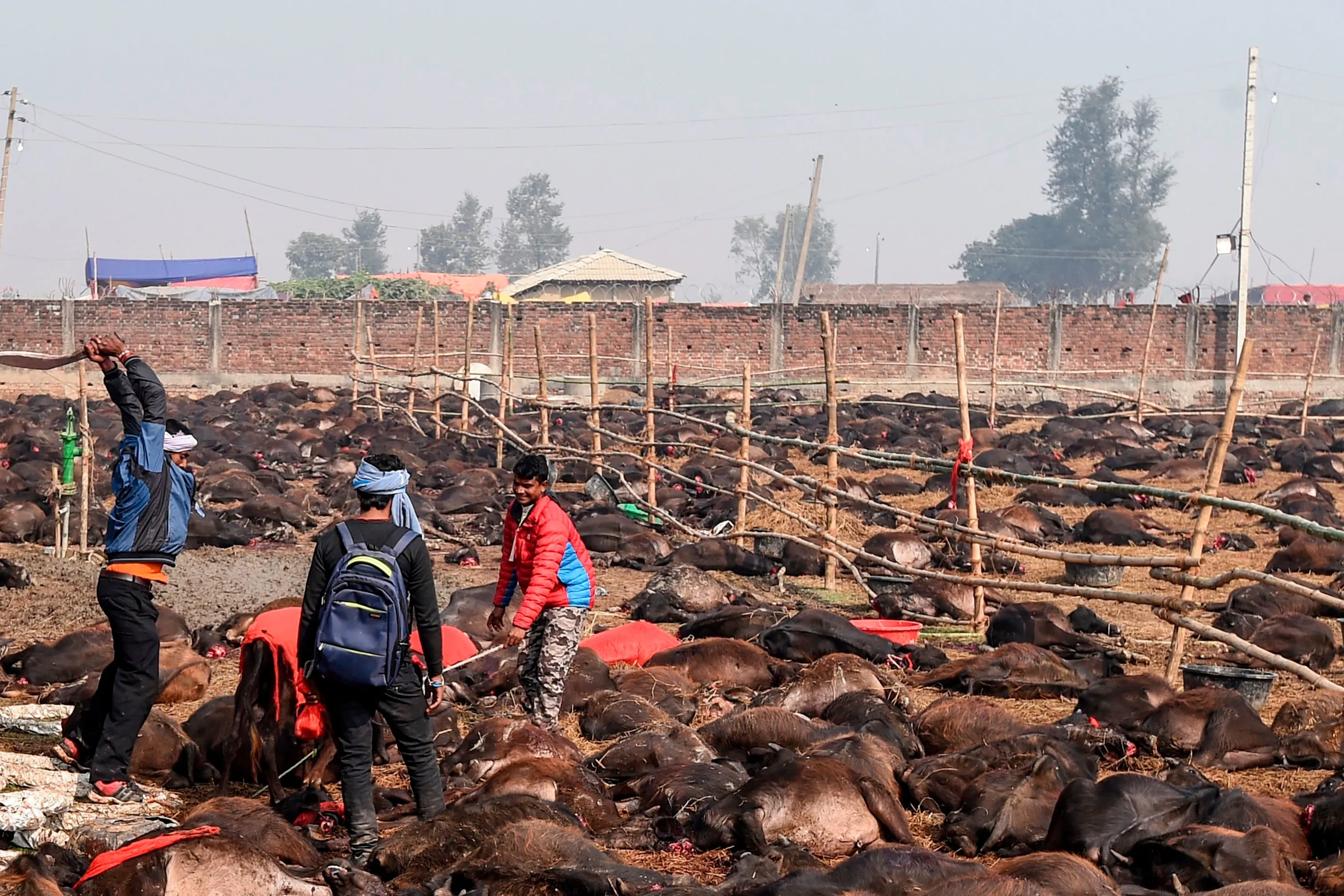 A Hindu devotee slaughters a buffalo as an offering to Hindu goddess Gadhimai during the Gadhimai Festival in Bariyarpur, 160 kms south of the capital Kathmandu on December 3, 2019. The stench of raw meat hung in the air and pools of blood dotted the muddy ground on December 3 as what is thought to be the world's biggest animal sacrifice swung into action in a remote area of Nepal. (Photo by Prakash Mathema/AFP Photo)