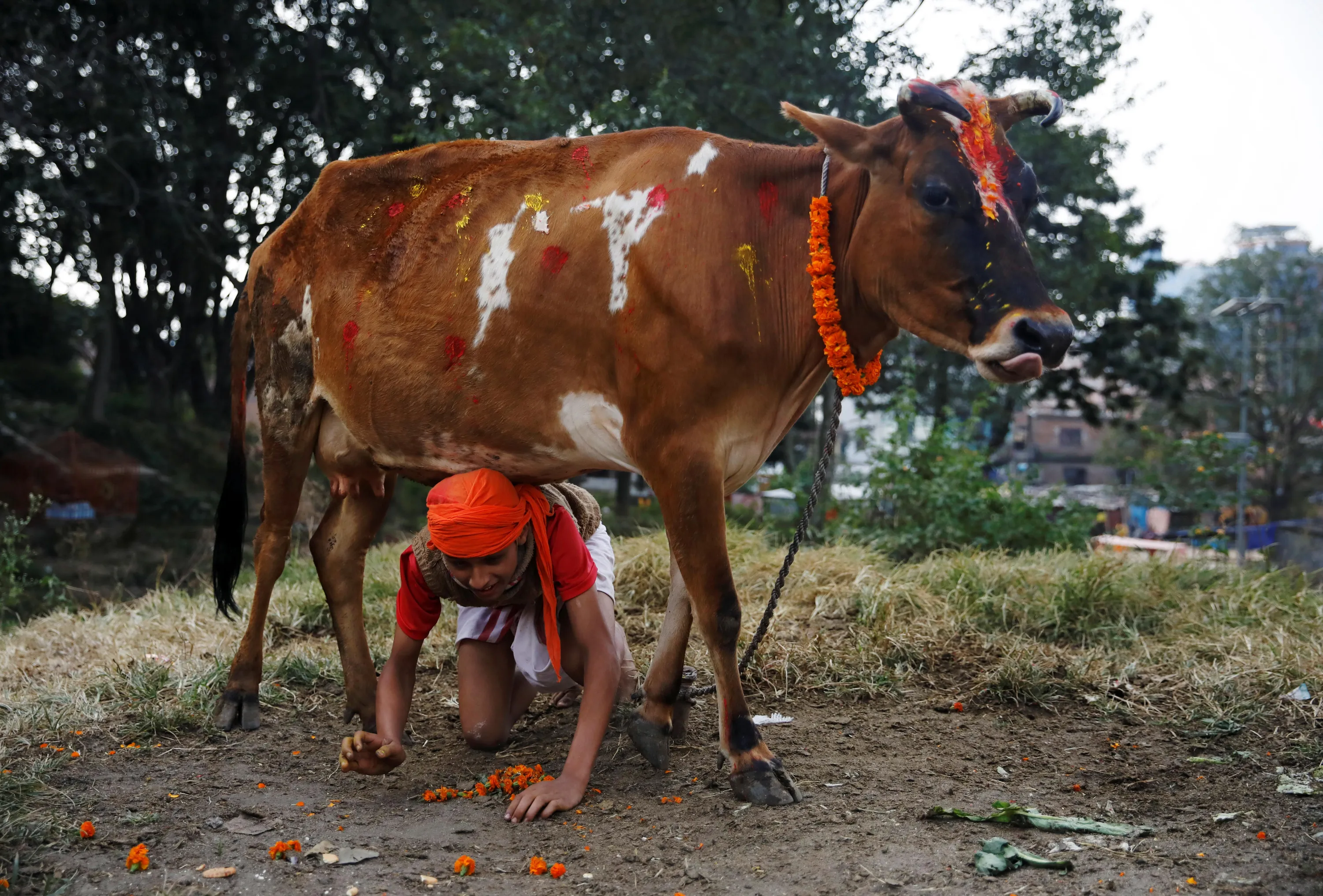 A young Hindu priest crawls under a cow during a religious ceremony celebrating the Tihar festival, also known as Diwali, in Kathmandu, Nepal on October 28, 2019. (Photo by Navesh Chitrakar/Reuters)