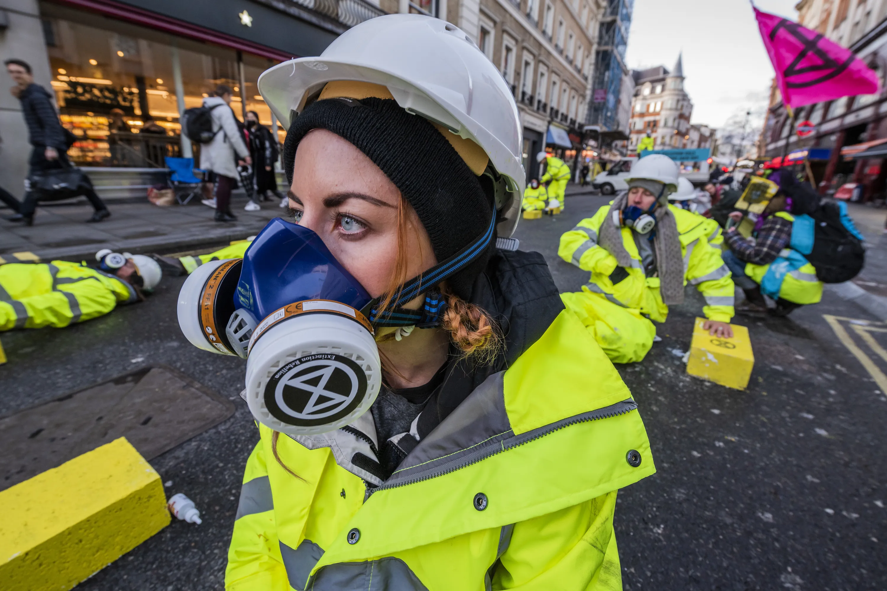 Extinction Rebellion protesters block Cranbourne Street, outside Leicester Square Station in London, England on December 9, 2019, to demand action on air pollution. The roadblock includes 25 breeze blocks glued to the road to symbolise the 25 Londoners who die each day as a result of air pollution and eight people are glued onto the blocks. Extinction Rebellion's 12 Days of Crisis to ensure the Climate and Ecological Emergency is at the top of the agenda this General Election. (Photo by Guy Bell/Rex Features/Shutterstock)