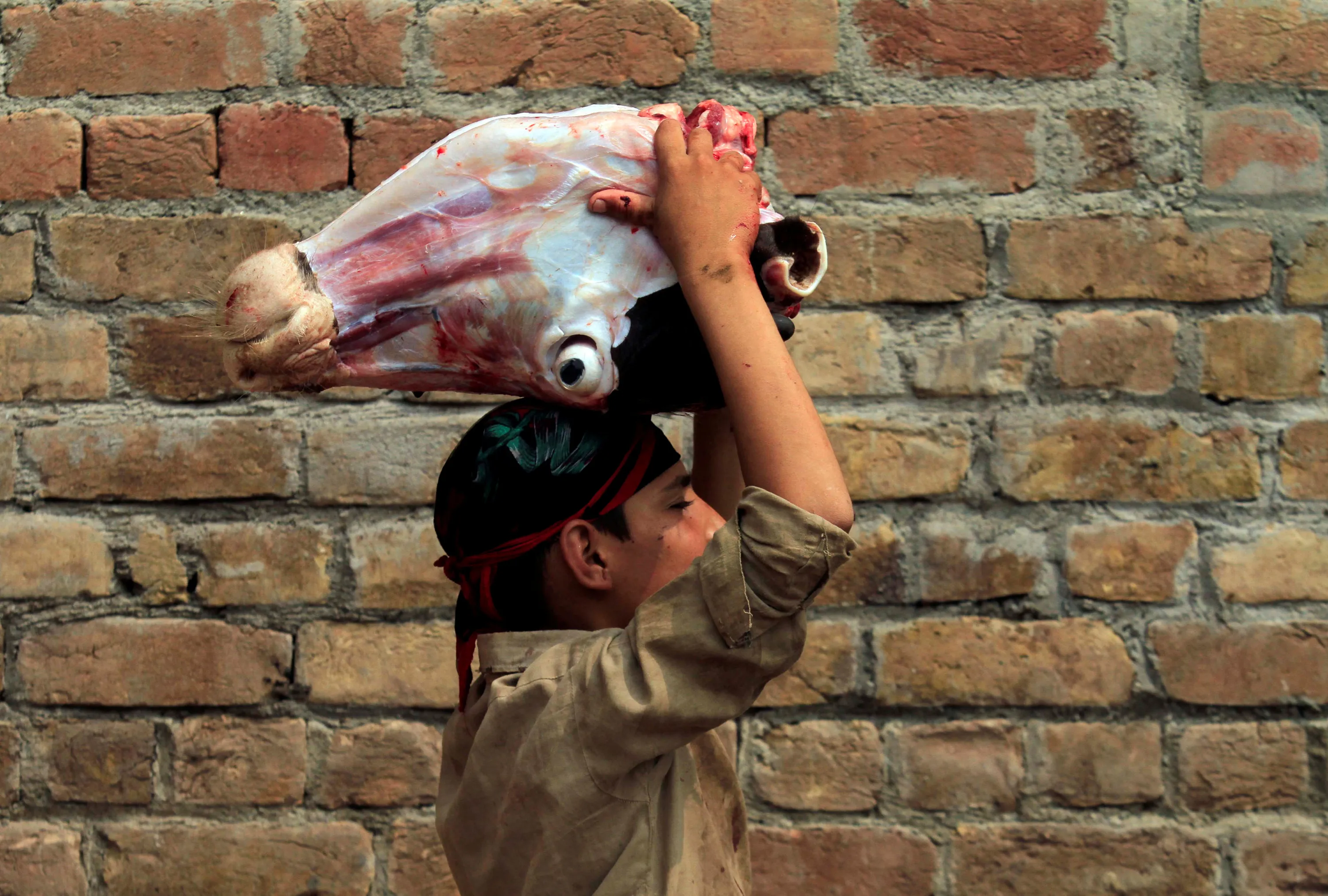 A worker carries a cow's head at a slaughterhouse in Peshawar, Pakistan on July 26, 2017. (Photo by Fayaz Aziz/Reuters)