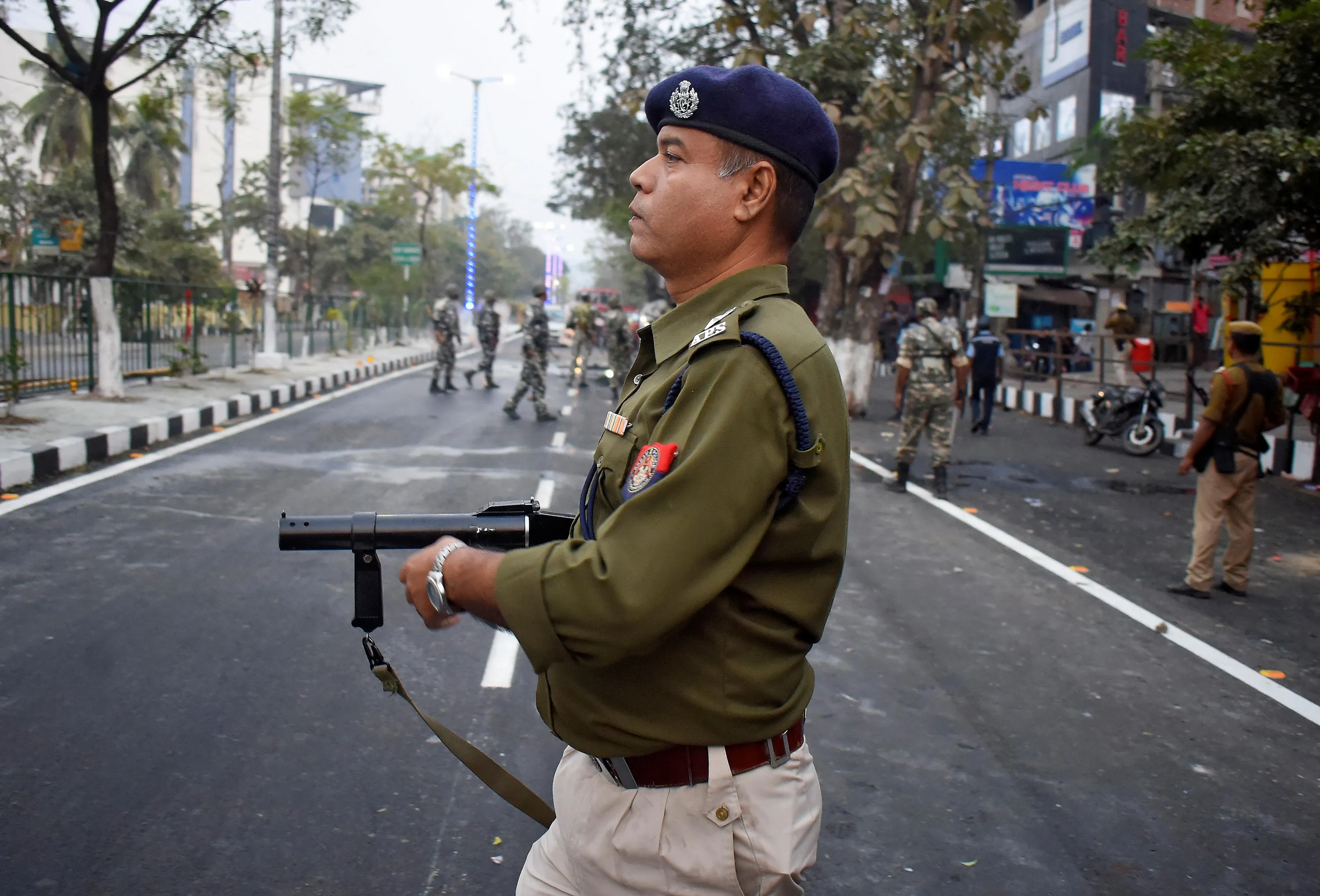 A police officer holds a tear gas gun during a protest against Citizenship Amendment Bill (CAB), a bill that seeks to give citizenship to religious minorities persecuted in neighbouring Muslim countries, in Guwahati, December 10, 2019. (Photo by Anuwar Hazarika/Reuters)
