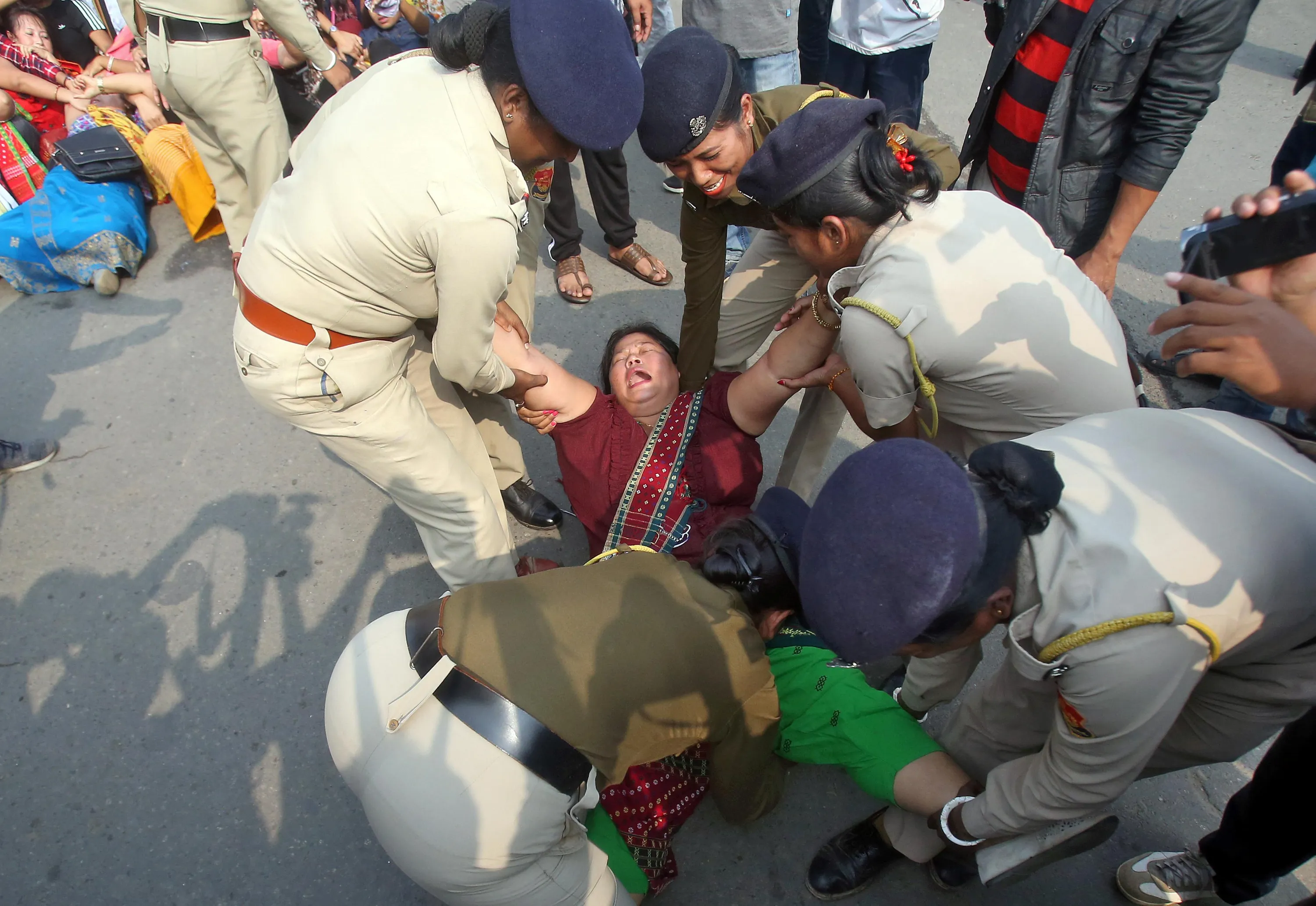 A demonstrator reacts as she is detained by police during a protest against the Citizenship Amendment Bill, a bill that seeks to give citizenship to religious minorities persecuted in neighbouring Muslim countries, in Agartala, December 10, 2019. (Photo by Jayanta Dey/Reuters)
