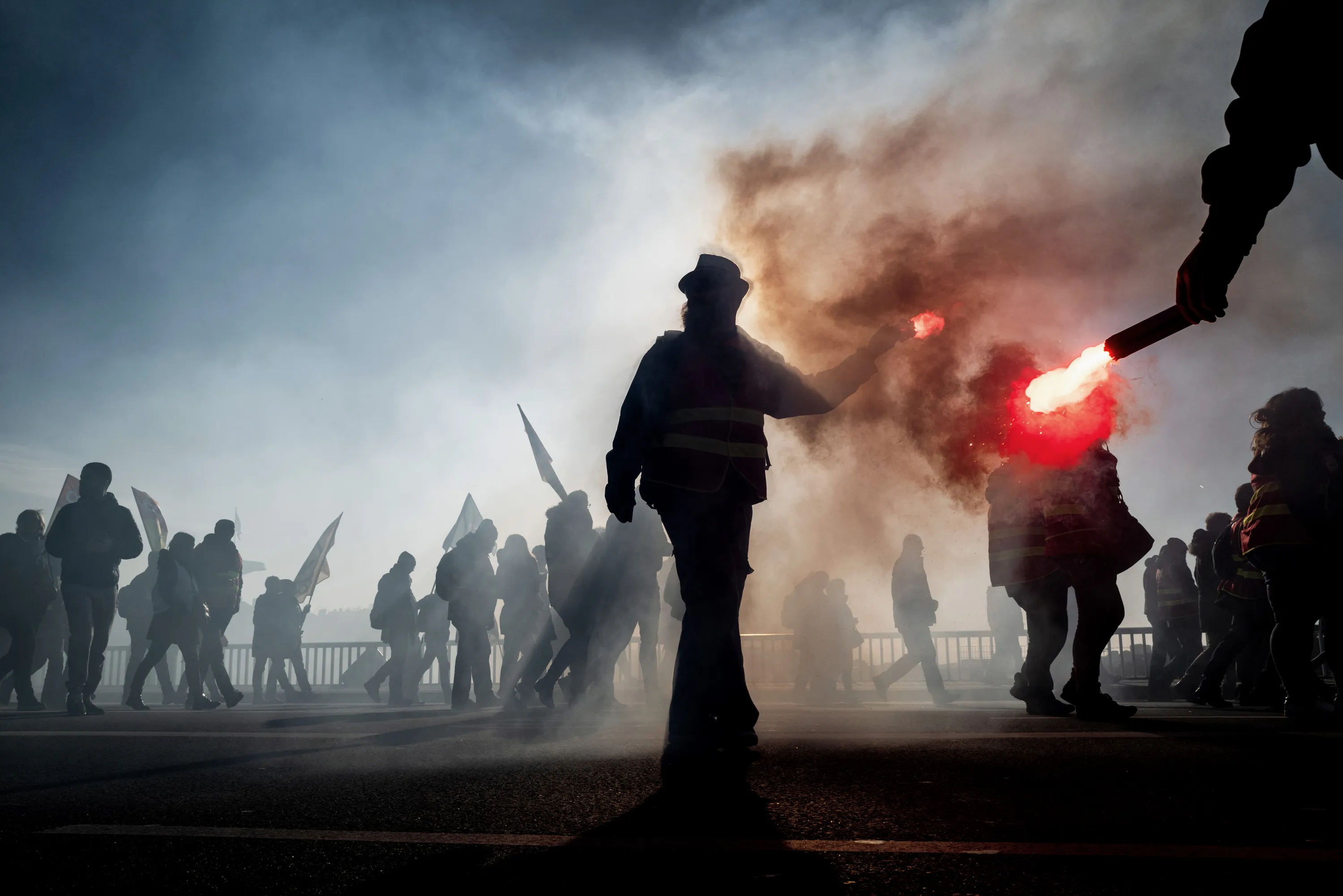 Protesters hold flares during a demonstration on December 10, 2019 in Lyon as part of the sixth day of massive strike action over government's plans to overhaul the pension system. French unions have vowed to keep up the fight over the reforms, which are set to be finalised and published on December 11, with mass demonstrations in Paris and other cities, with teachers and other workers who once again have walked out alongside transport workers. (Photo by Jeff Pachoud/AFP Photo)