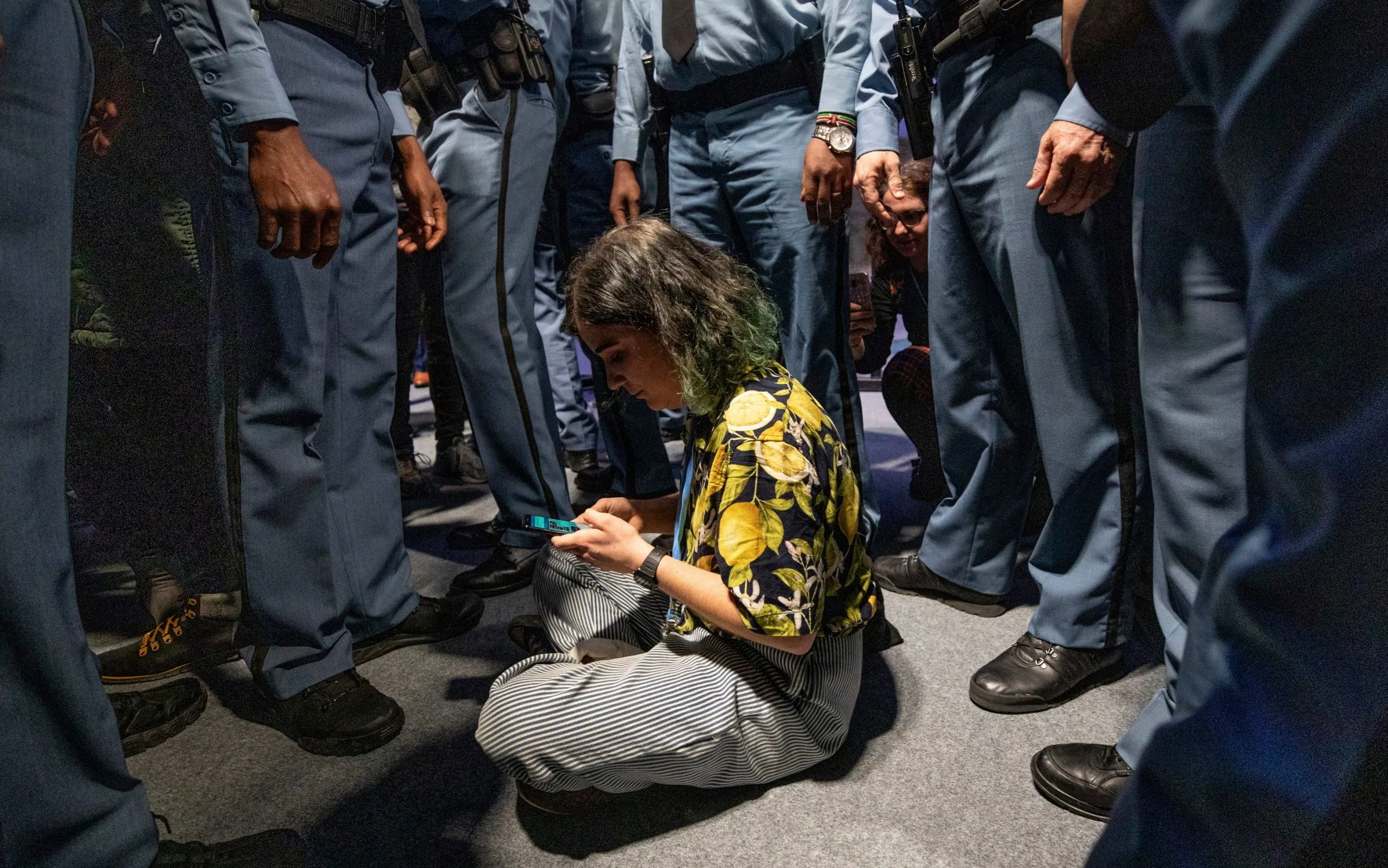 A demonstrator is surrounded by UN security staff members during a protest at the COP25 summit in Madrid, Wednesday December 11, 2019. World leaders agreed in Paris four years ago to keep global warming below 2 degrees Celsius (3.6 degrees Fahrenheit), ideally no more than 1.5 C (2.7 F) by the end of the century. Scientists say countries will miss both of those goals by a wide margin unless drastic steps are taken to begin cutting greenhouse gas emissions next year. Claiming that the message doesn't seem to be getting through to governments, over one hundred activists led by representatives of indigenous peoples from Latin and North America made their way to the talks' venue, blocking for some tense minutes the entrance to a plenary meeting where U.N. Secretary General António Guterres was about to speak. (Photo by Bernat Armangue/AP Photo)