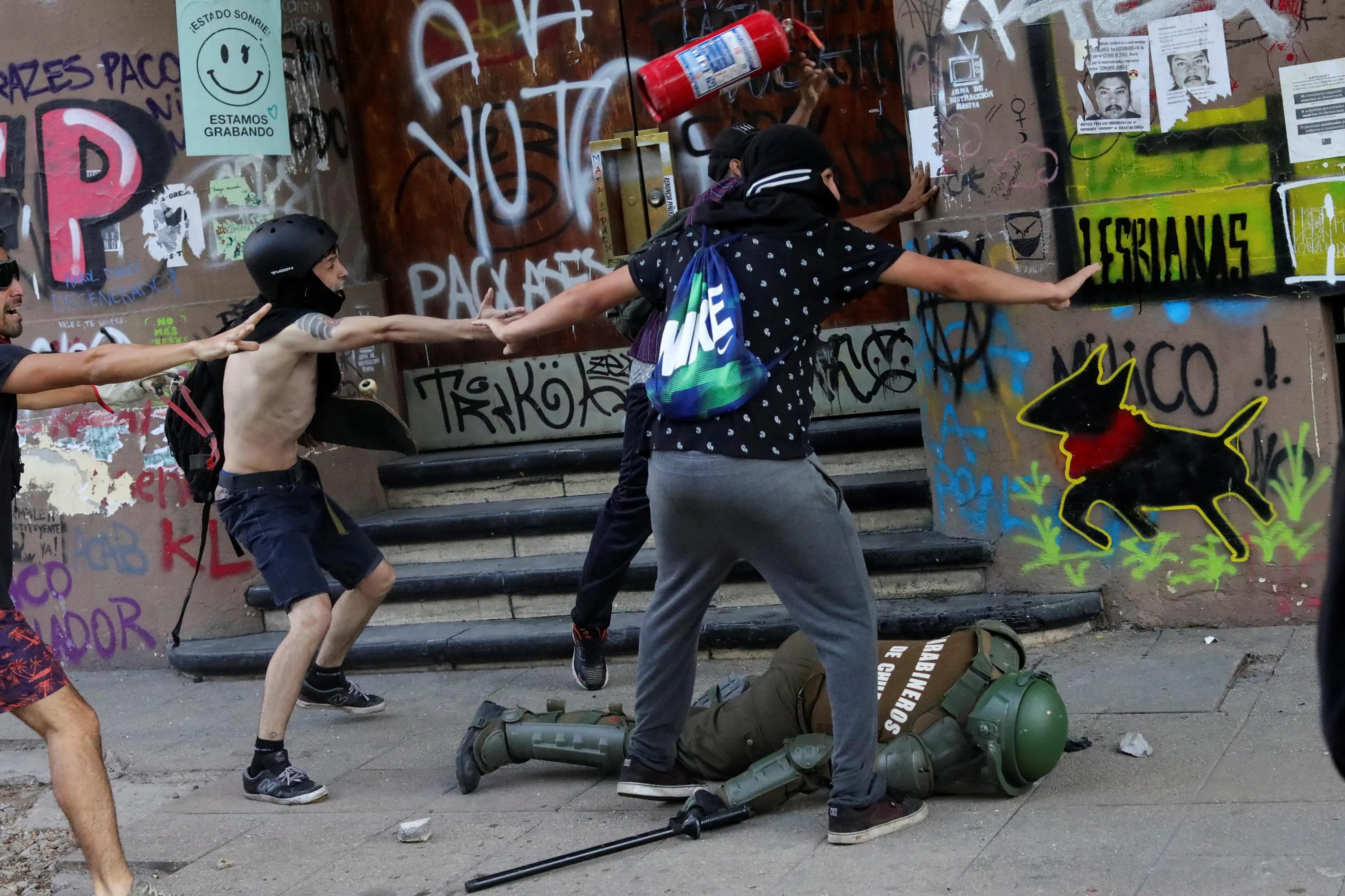 A member of the security forces lies on the ground as a demonstrator holds an extinguisher and others gesture during a protest against Chile's government in Santiago, Chile on December 12, 2019. (Photo by Pablo Sanhueza/Reuters)