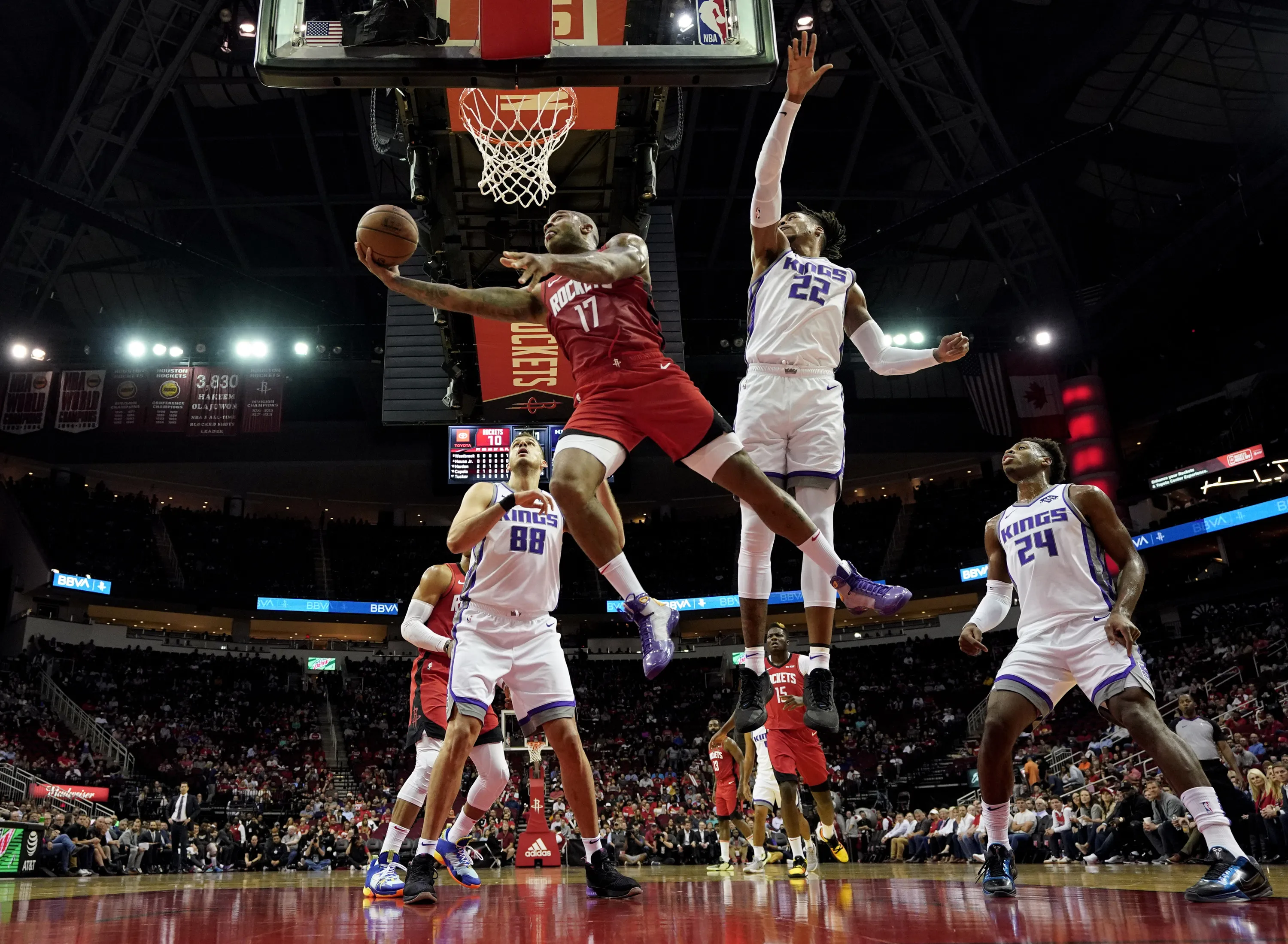 Houston Rockets' PJ Tucker (17) goes up for a shot as Sacramento Kings' Nemanja Bjelica (88), Richaun Holmes (22) and Buddy Hield (24) defend during the first half of an NBA basketball game Monday, December 9, 2019, in Houston. (Photo by David J. Phillip/AP Photo)