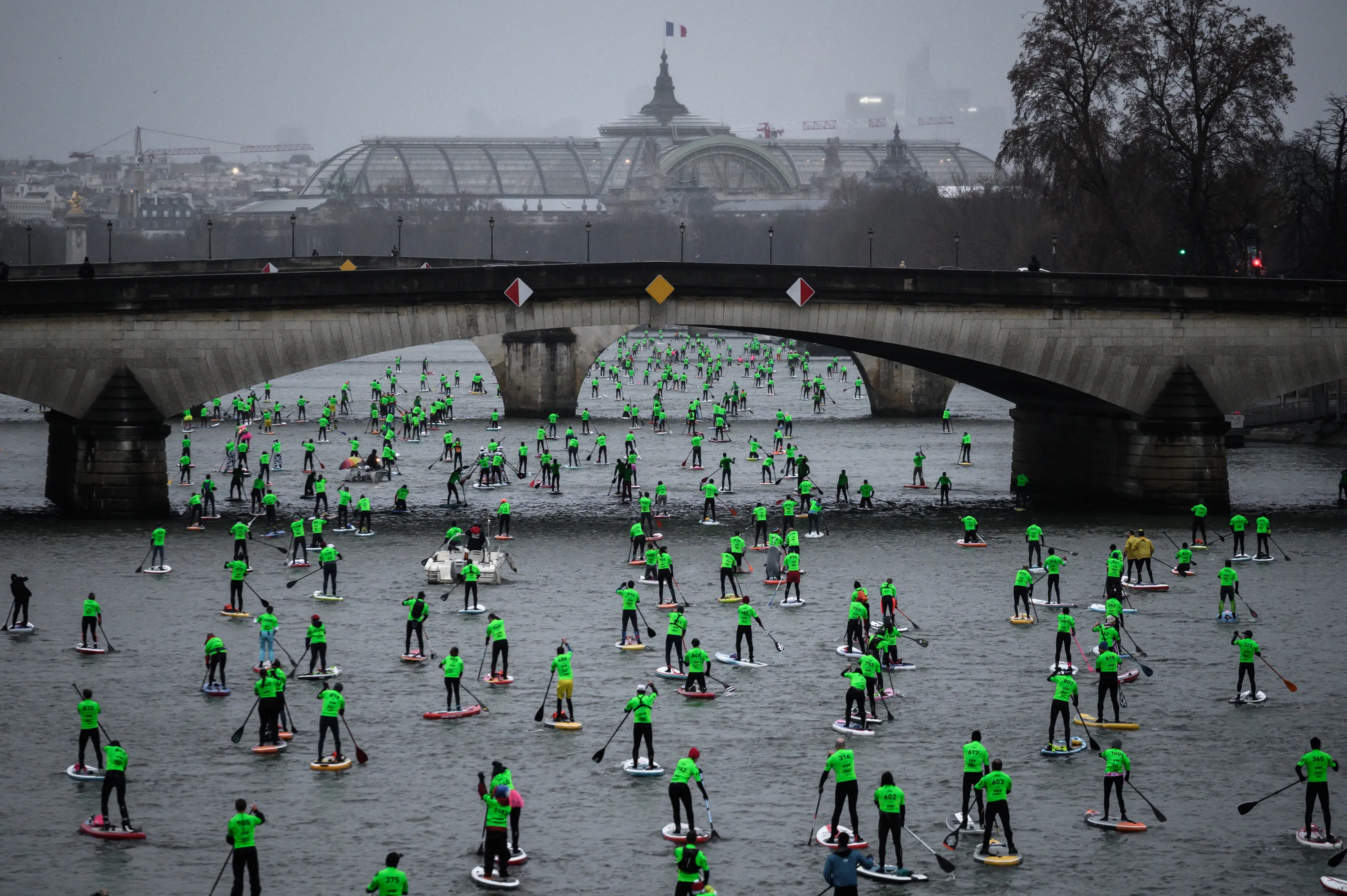 Competitors take part in the Nautic Paddle Race on the Seine river with The Grand Palais in the background in Paris on December 8, 2019. About 1000 competitors took part in the 11 kilometer race on the Seine River in the French capital. (Photo by Philippe Lopez/AFP Photo)
