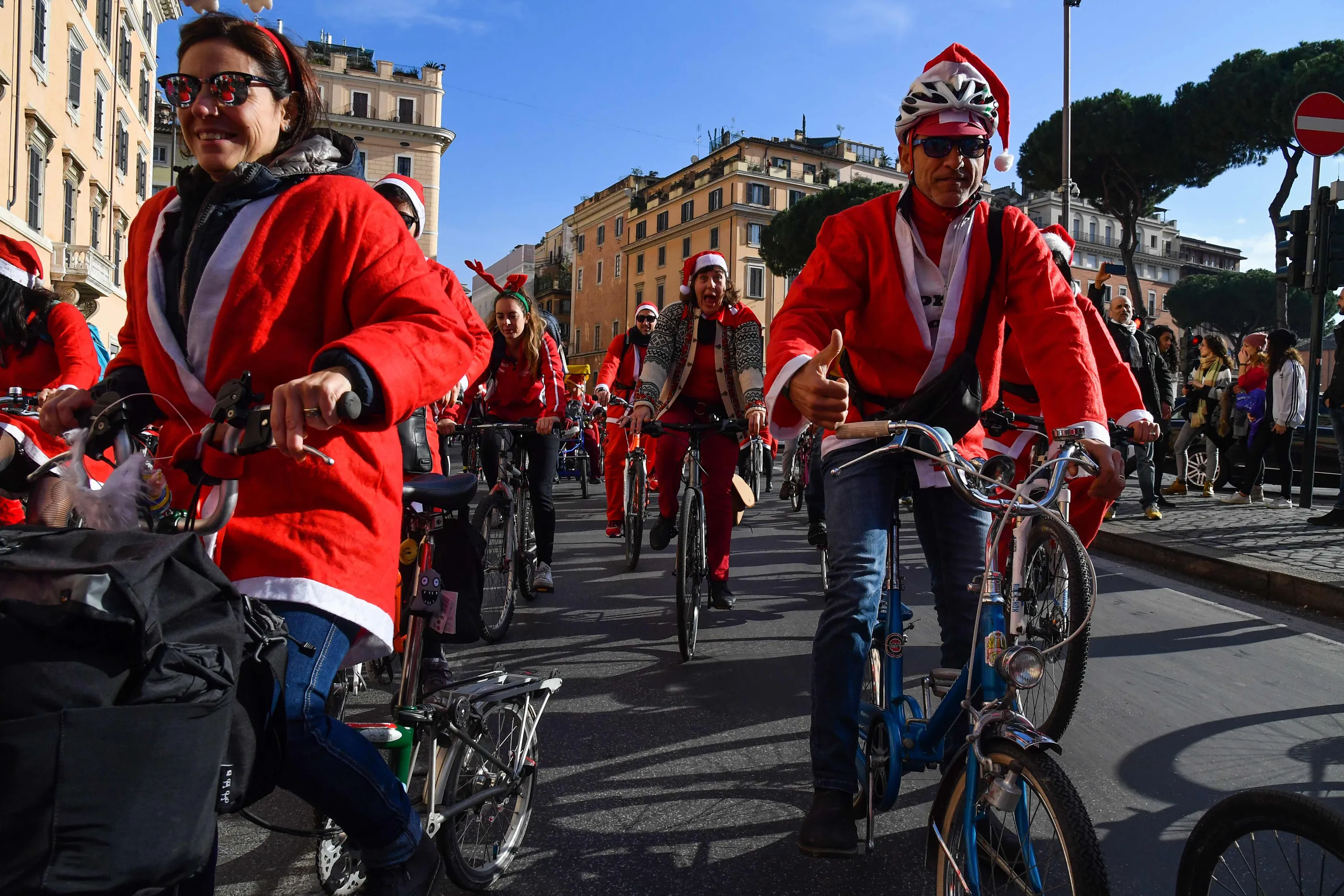People dressed as Santa Claus take part in a Santa Claus Christmas charity ride for the association The Houses of Peter Pan, on december 15, 2019 through Largo di Torre Argentina in downtown Rome. Peter Pan's Houses encourages sharing, socialization and mutual support between families. (Photo by Andreas Solaro/AFP Photo)