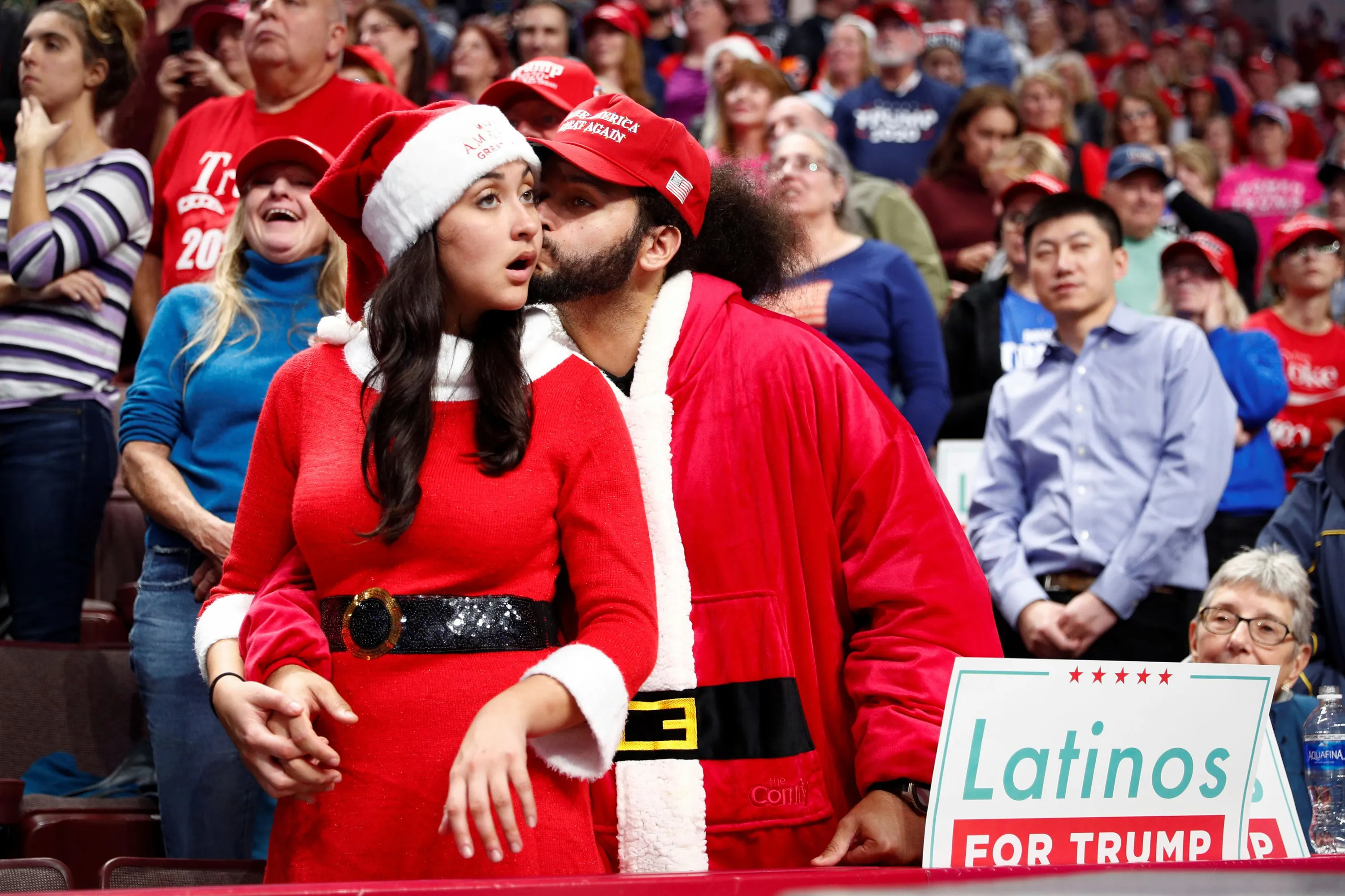 Members of the audience embrace near a “Latinos For Trump” sign as U.S. President Donald Trump delivers remarks during a campaign rally at the Giant Center in Hershey, Pennsylvania, U.S., December 10, 2019. (Photo by Tom Brenner/Reuters)