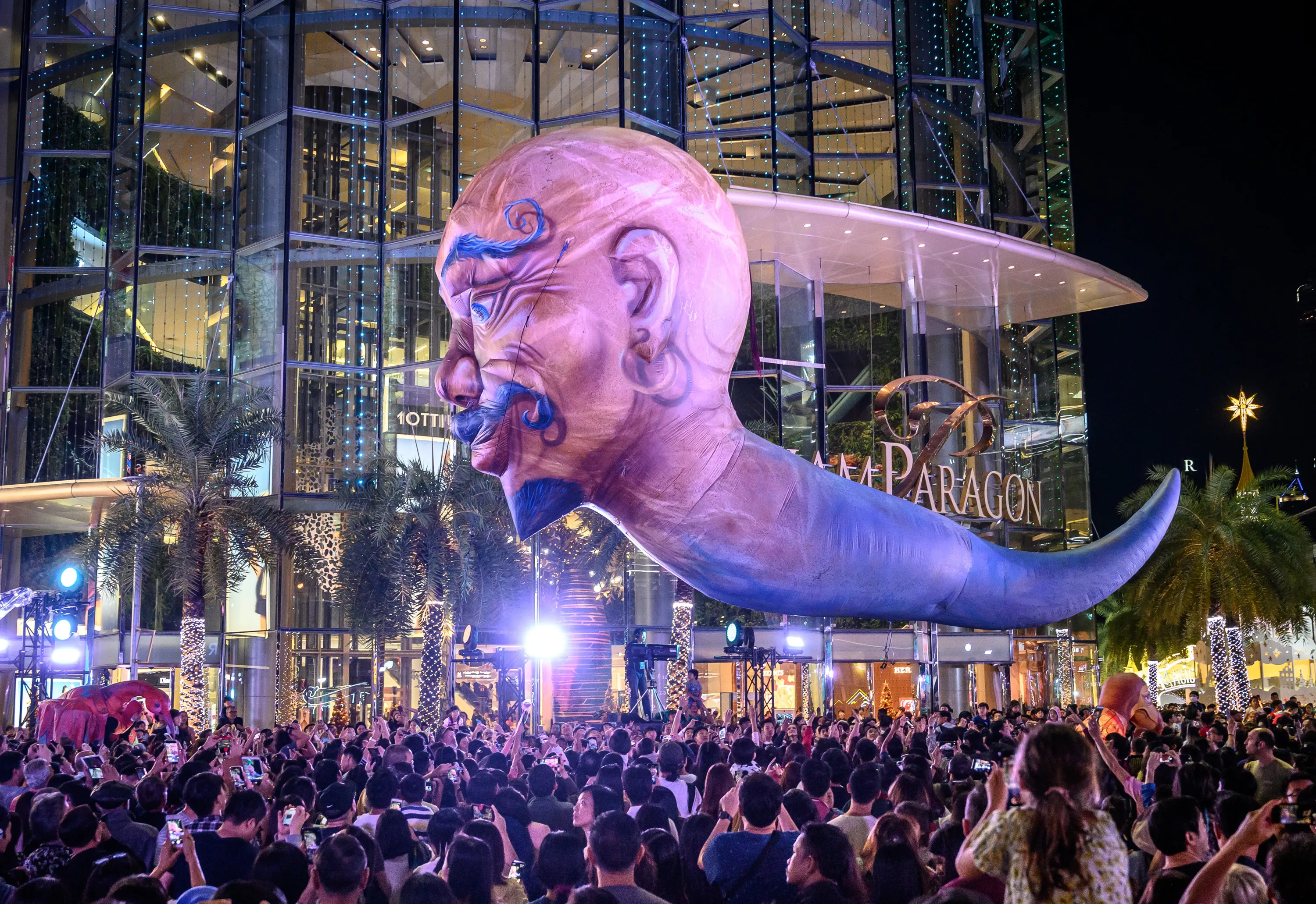 A giant balloon representing a mythical creature flies over the crowd during “The Quest of Adventure in the World of Magical Tales” Christmas show performed by French group Plasticiens Volants in Bangkok on December 8, 2019. (Photo by Mladen Antonov/AFP Photo)