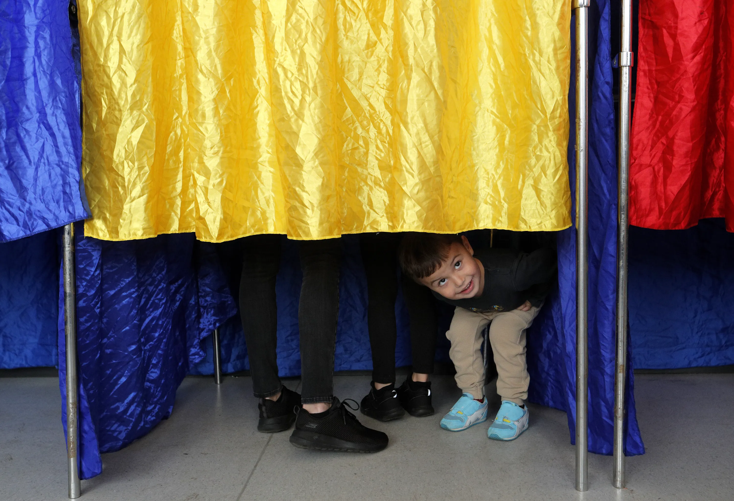 A Romanian kid stare out of the voting booth while waiting for his mother to stamp her ballot at 'Cezar Bolliac' polling station during the first round of presidential elections in Bucharest, Romania, 10 November 2019. Romanians are voting today for the first round of the presidential elections. (Photo by Robert Ghement/EPA/EFE)