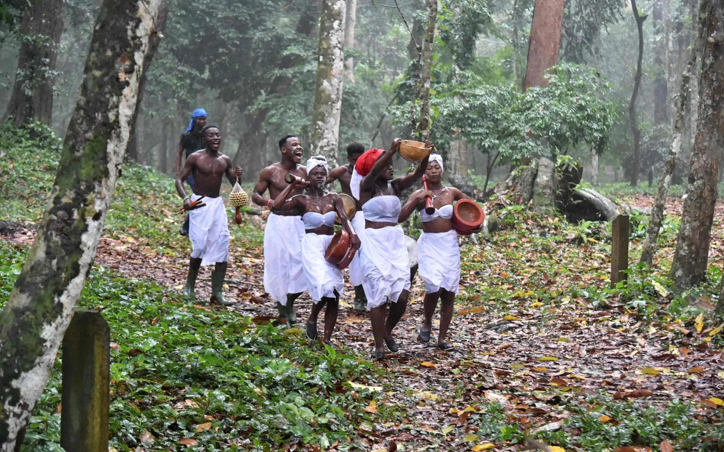 A group of female priests perform in Banco National Park on December 08, 2019 in Abidjan during the opening of the first Green Arts Biennale. Ephemeral sculptures by international artists in the middle of the tropical forest is the challenge of the first Green Arts biennial that took place in the Banco National Park in Abidjan The Banco National Park extends over nearly 3,500 hectares in the heart of Abidjan, just a few kilometres from the Plateau business district between the two main working class districts of Abobo and Yopougon. (Photo by Sia Kambou/AFP Photo)