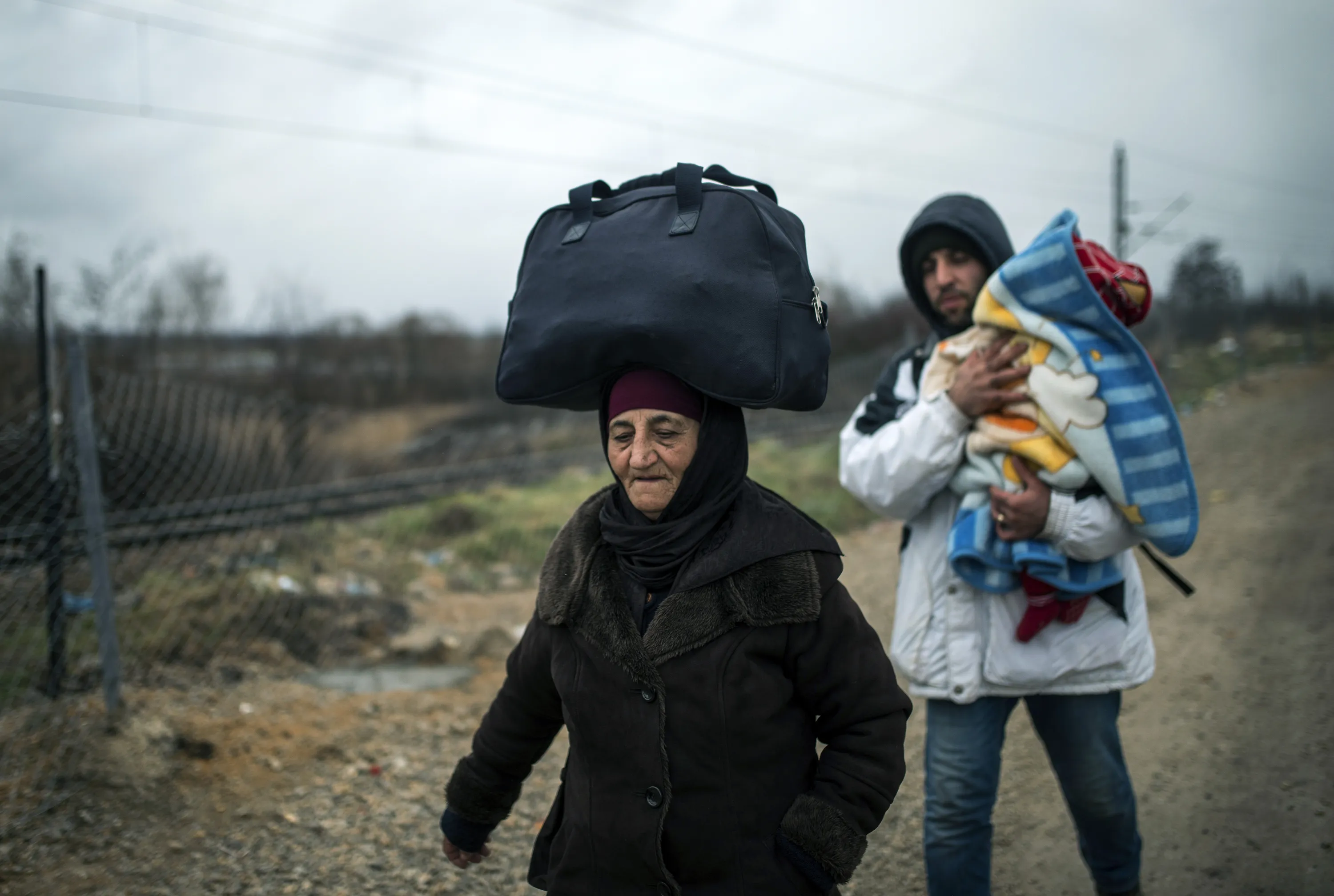 A woman balances a bag on ther head and a man carries a child as migrants and refugees make their way across the Macedonia-Serbia border at Tabanovce, on February 4, 2016. More than a million people headed to Europe in search of new lives last year, most of them refugees fleeing conflict in Syria, Iraq and Afghanistan in the continent's worst migration crisis since World War II. The onset of winter does not appear to have deterred the migrants. (Photo by Robert Atanasovski/AFP Photo)