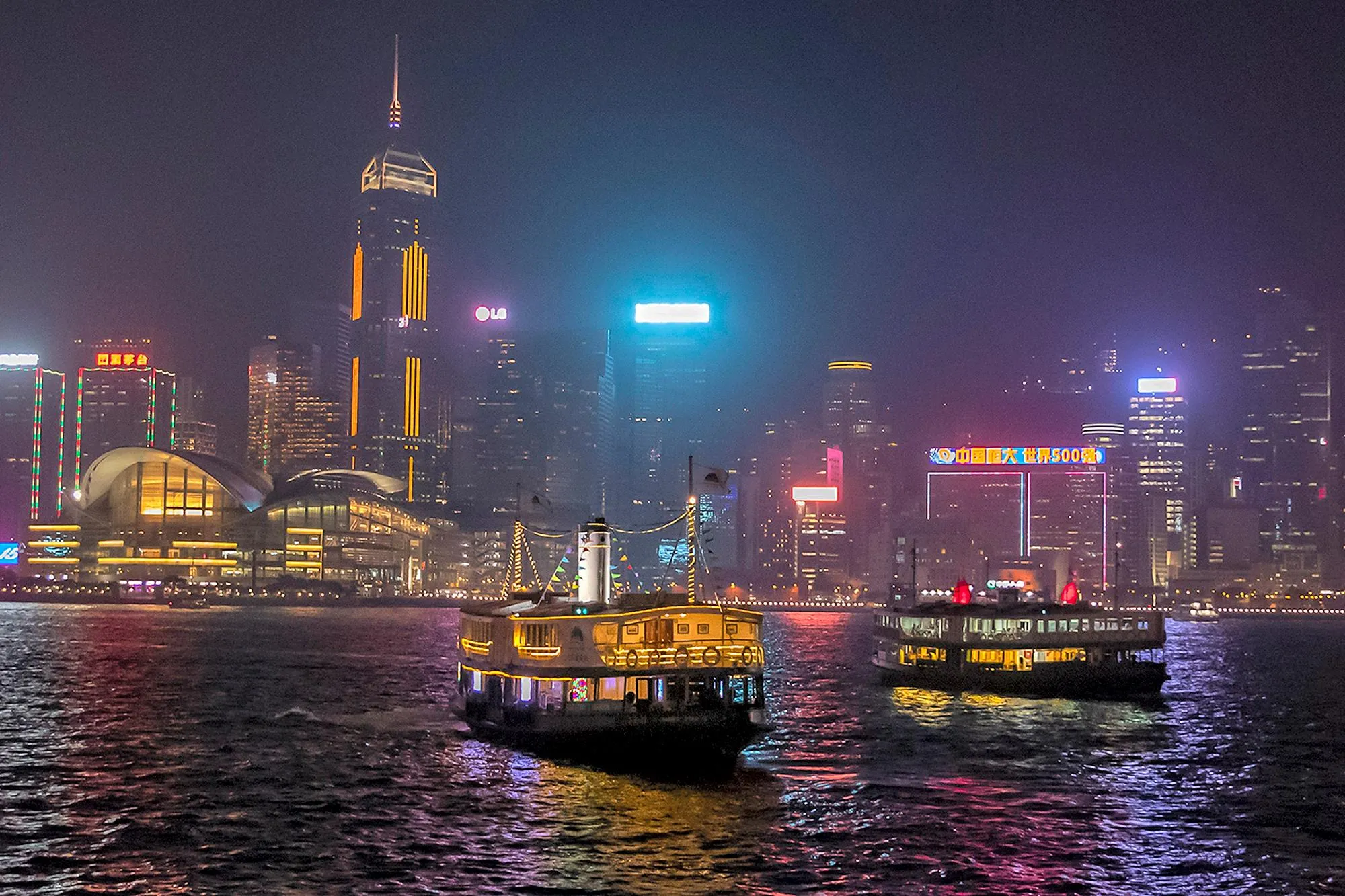 The lights of Hong Kong Island are reflected in the water as Star Ferry boats cross the harbor from Kowloon, in Hong Kong, Friday, December 13, 2019. Despite six months of ongoing pro-democracy protests in Hong Kong, day to day life continues as normal in much of the city. (Photo by Mark Schiefelbein/AP Photo)