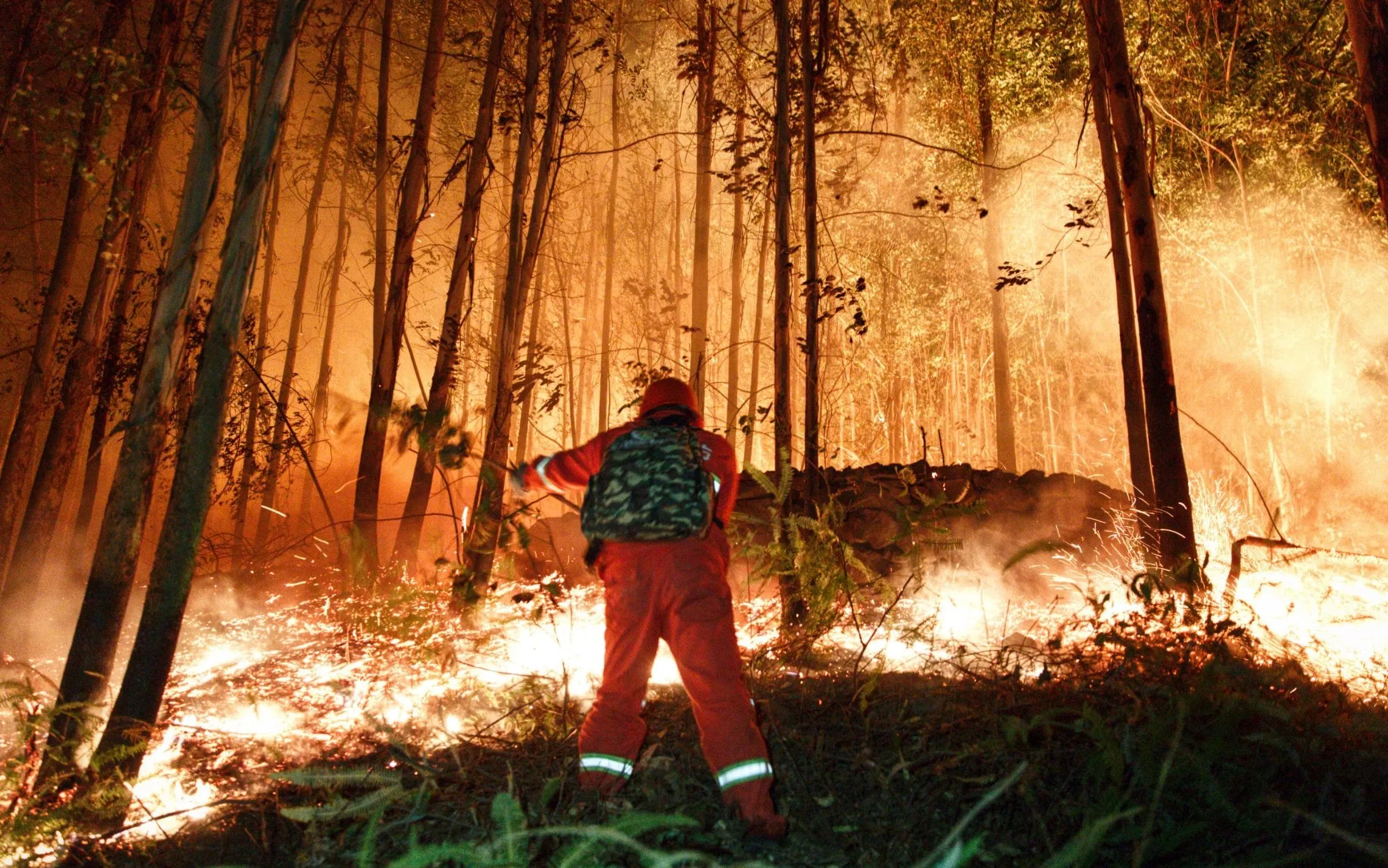 A firefighter combats the blaze as a mountain fire is raging at Gaoming District on December 7, 2019 in Foshan, Guangdong Province of China. The fire broke out on Lingyun Mountain on Thursday afternoon in Foshan. No casualties have been reported. (Photo by VCG/VCG via Getty Images)