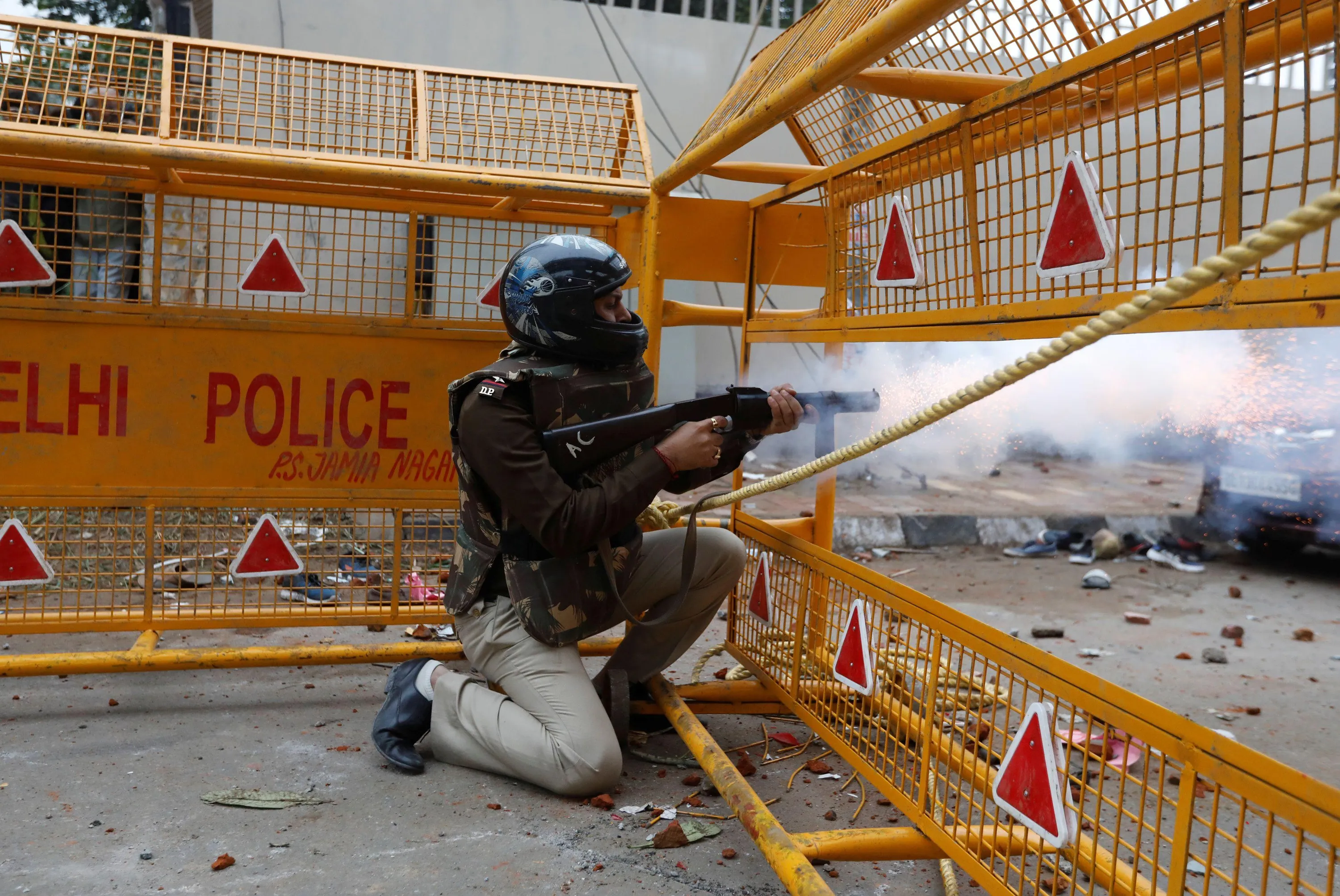 A police officer fires a tear gas shell towards protestors during a protest against the Citizenship Amendment Bill, a bill that seeks to give citizenship to religious minorities persecuted in neighbouring Muslim countries, outside the Jamia Millia Islamia University in New Delhi, India, December 13, 2019. (Photo by Adnan Abidi/Reuters)