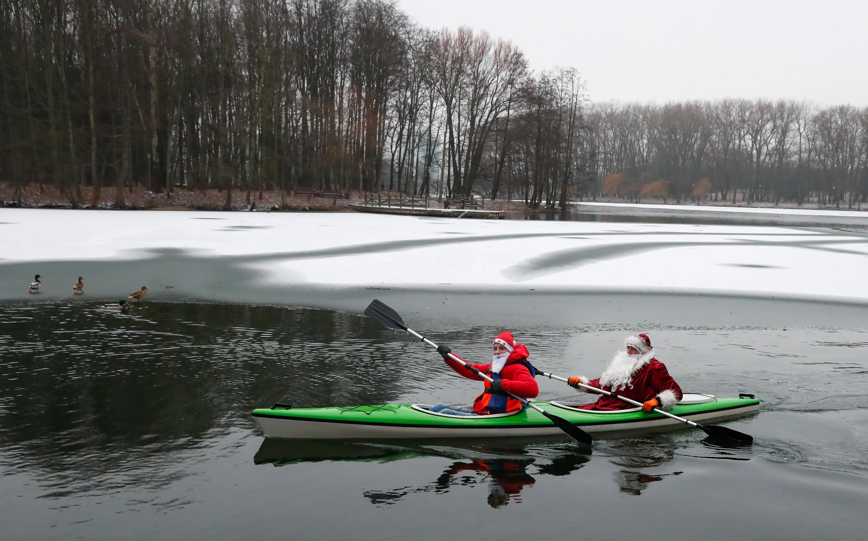 Belarusians dressed as Santa Clauses swim in a kayak during country's Santa Run in Minsk, Belarus, December 14, 2019. (Photo by Vasily Fedosenko/Reuters)