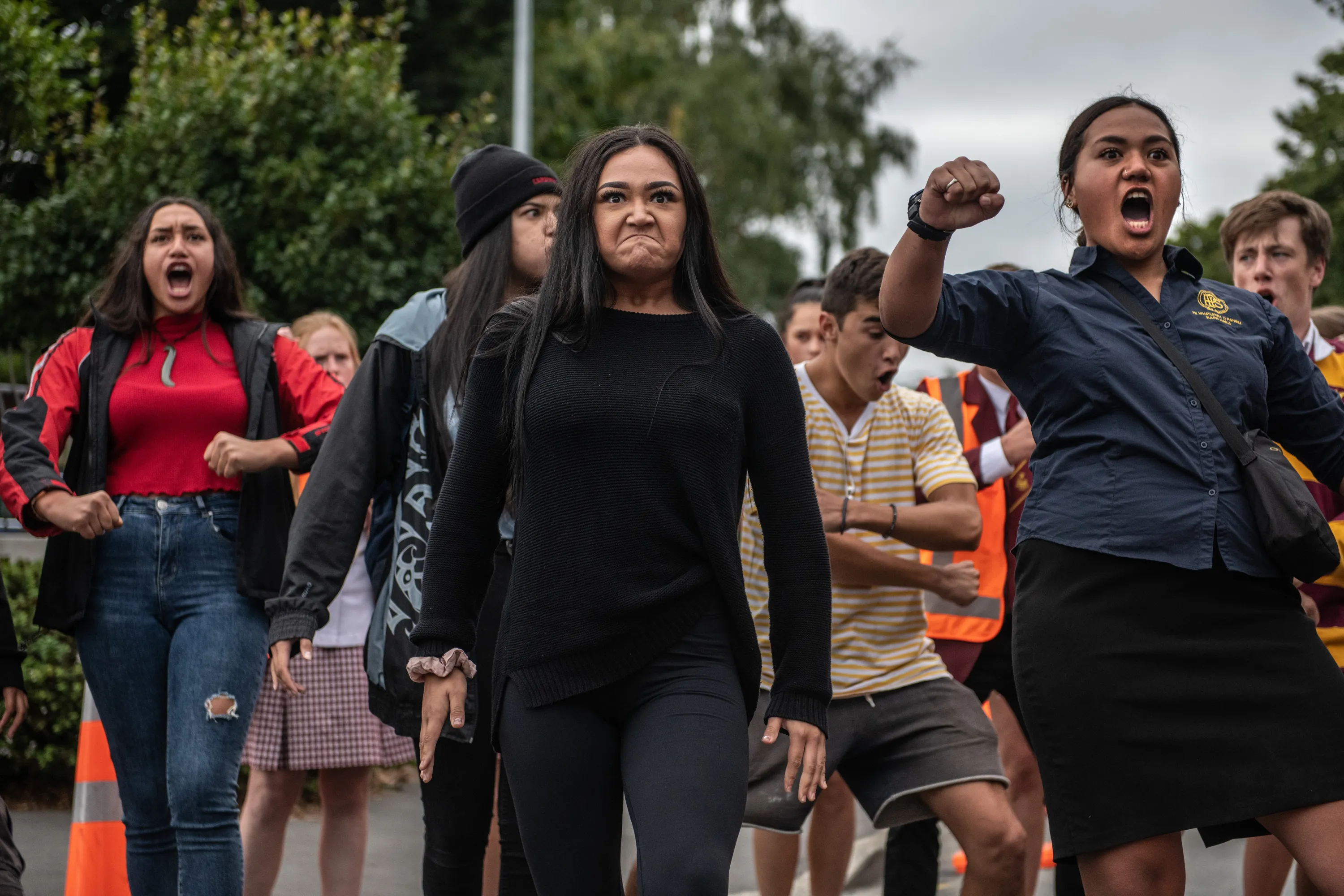 Youngsters perform a Haka during a students vigil near Al Noor mosque on March 18, 2019 in Christchurch, New Zealand. 50 people were killed, and dozens are still injured in hospital after a gunman opened fire on two Christchurch mosques on Friday, 15 March. The accused attacker, 28-year-old Australian, Brenton Tarrant, has been charged with murder and remanded in custody until April 5. The attack is the worst mass shooting in New Zealand's history. (Photo by Carl Court/Getty Images)