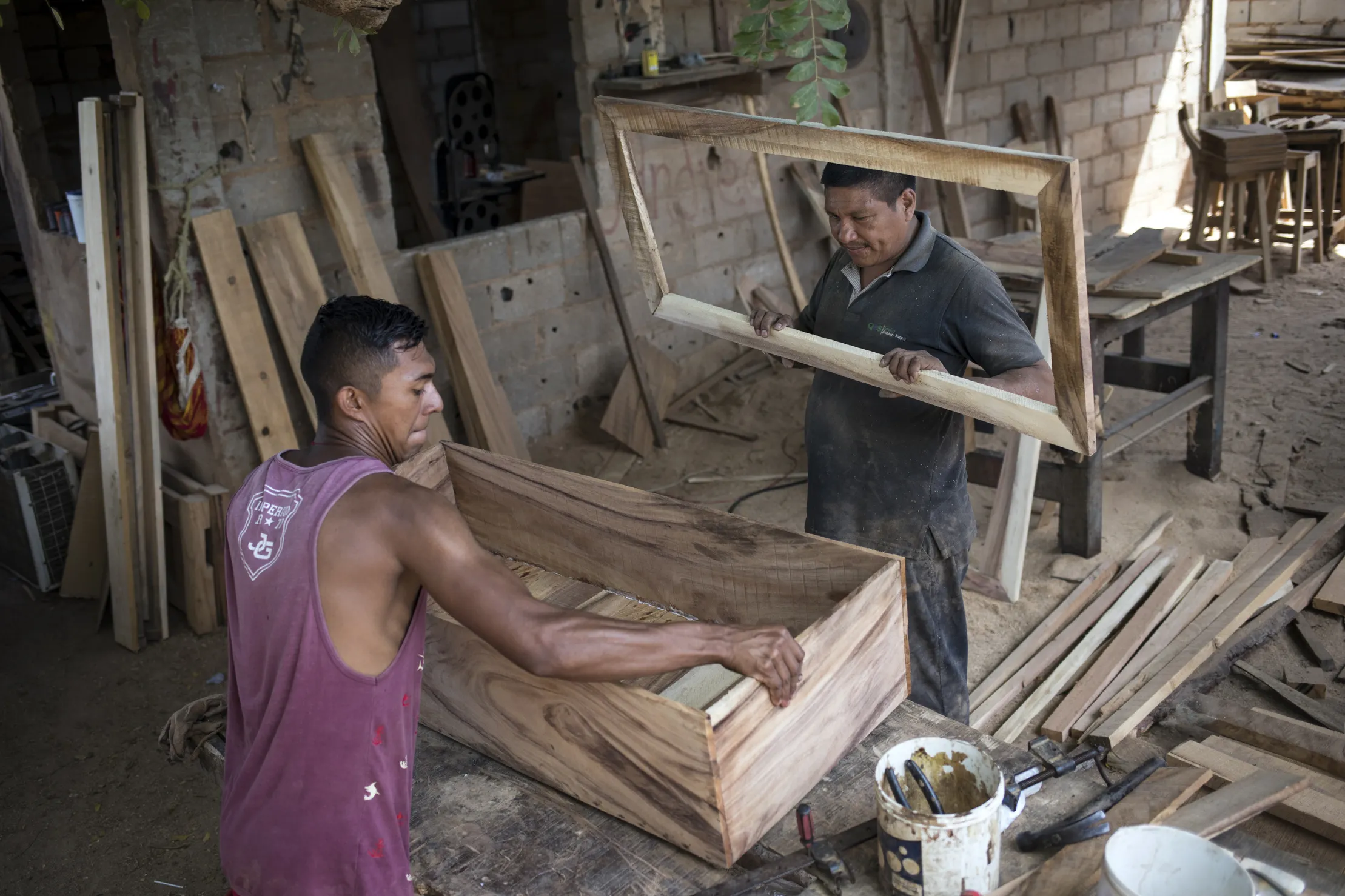 Sergio Morales, right, and Joelvis Cantillo, build a simple coffin at their furniture workshop in Maracaibo, Venezuela, November 20, 2019. Two years ago the carpenters started building coffins for less than $100 instead of furniture due to the high demand for cheaper coffins. (Photo by Rodrigo Abd/AP Photo)