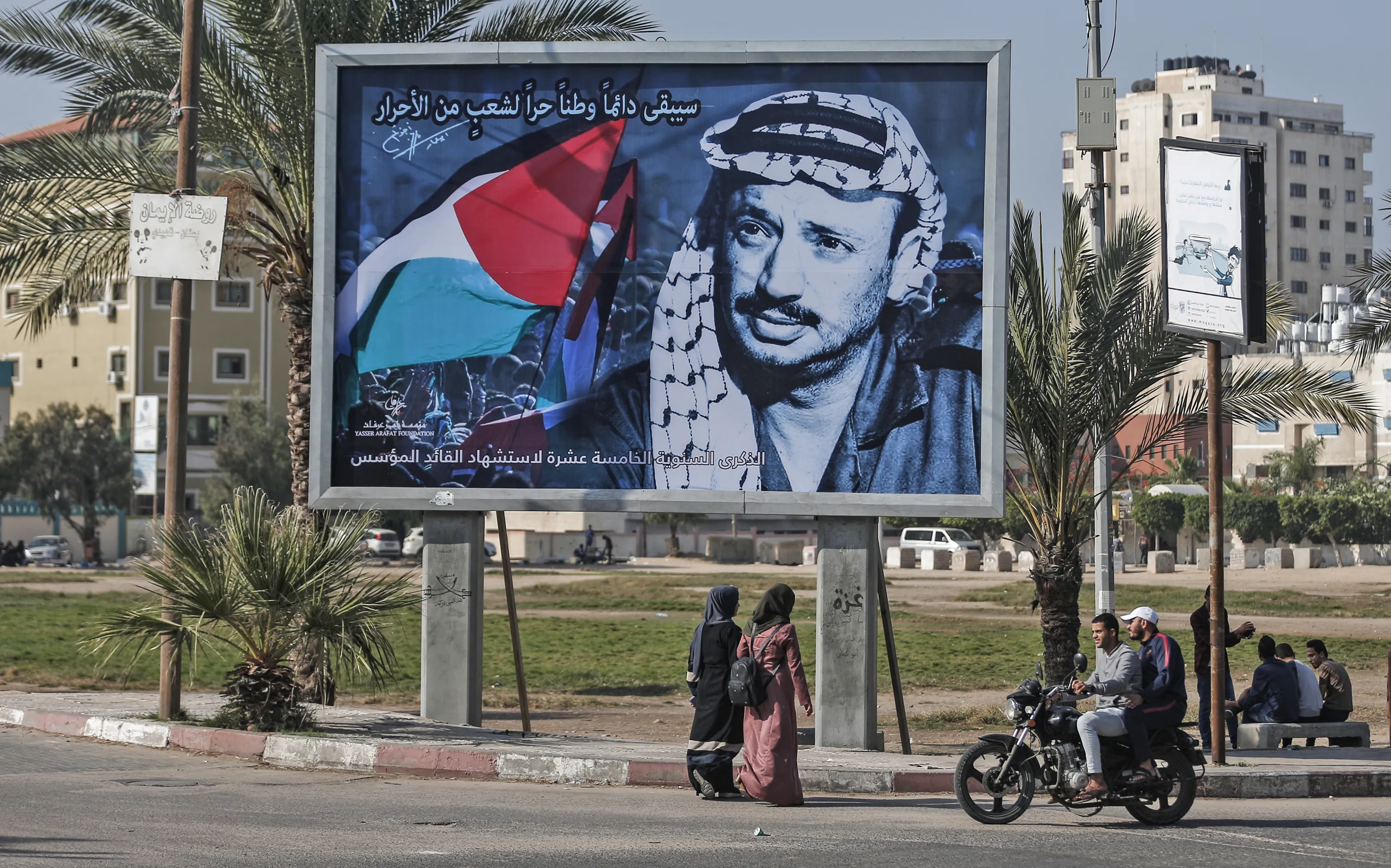 Palestinians walk past a billboard commemorating the 15th anniversary of the death of late Palestinian leader Yasser Arafat near his home in Gaza city, on November 11, 2019. (Photo by Mahmud Hams/AFP Photo)