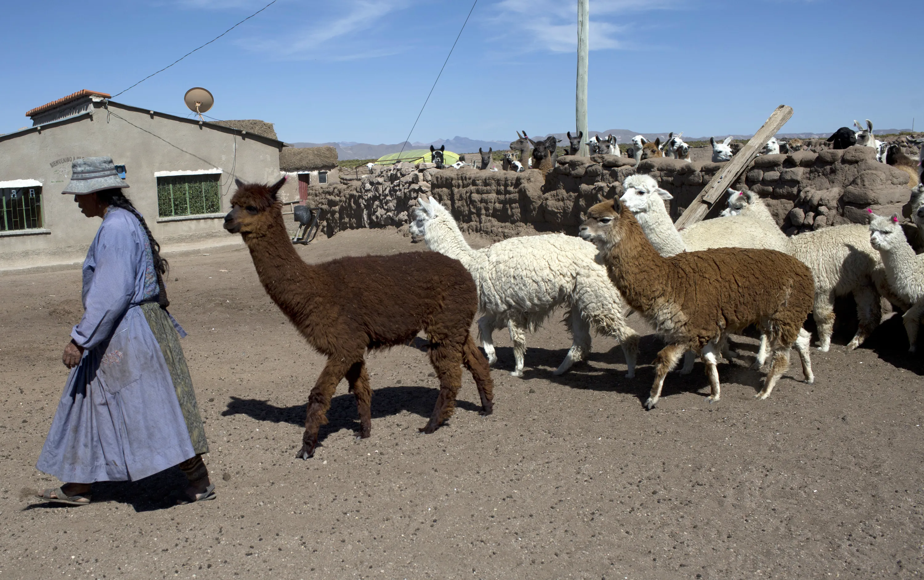 In this December 11, 2018 photo, shepherdess Genoveva Usnayo leads her llamas to a field to graze, on the outskirts of Santiago de Machaca, Bolivia. The decline in the traditional way of life in Bolivia's wetlands is noticeable, as young people leave behind ancestral customs in favor of taking a chance in the cities. “Now you just see elders and children herding the animals”, says anthropologist Carla Roda. (Photo by Juan Karita/AP Photo)