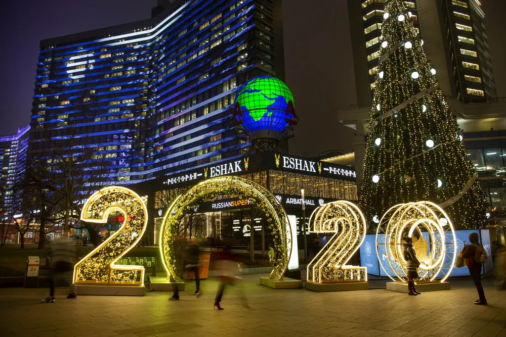 People walk in front of 2020 numbers of the upcoming new year decorated for Christmas and New Year celebrations in Novy Arbat street in Moscow, Russia, Wednesday, December 25, 2019. (Photo by Alexander Zemlianichenko/AP Photo)