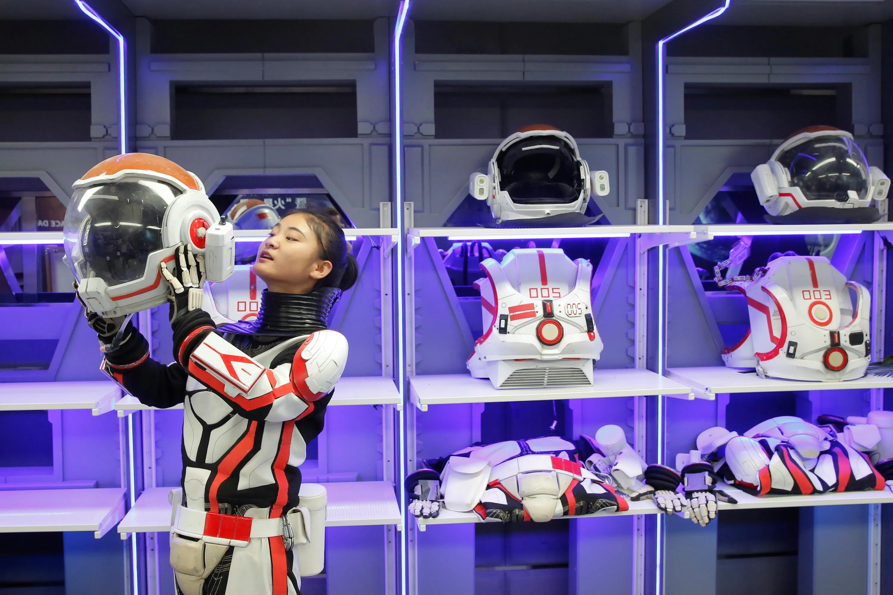 A staff member demonstrates how she puts on the helmet of a mock space suit at the C-Space Project Mars simulation base in the Gobi Desert outside Jinchang, Gansu Province, China, April 17, 2019. The facility – comprising several interconnected modules including a greenhouse and a mock decompression chamber – opened its doors to the public. (Photo by Thomas Peter/Reuters)