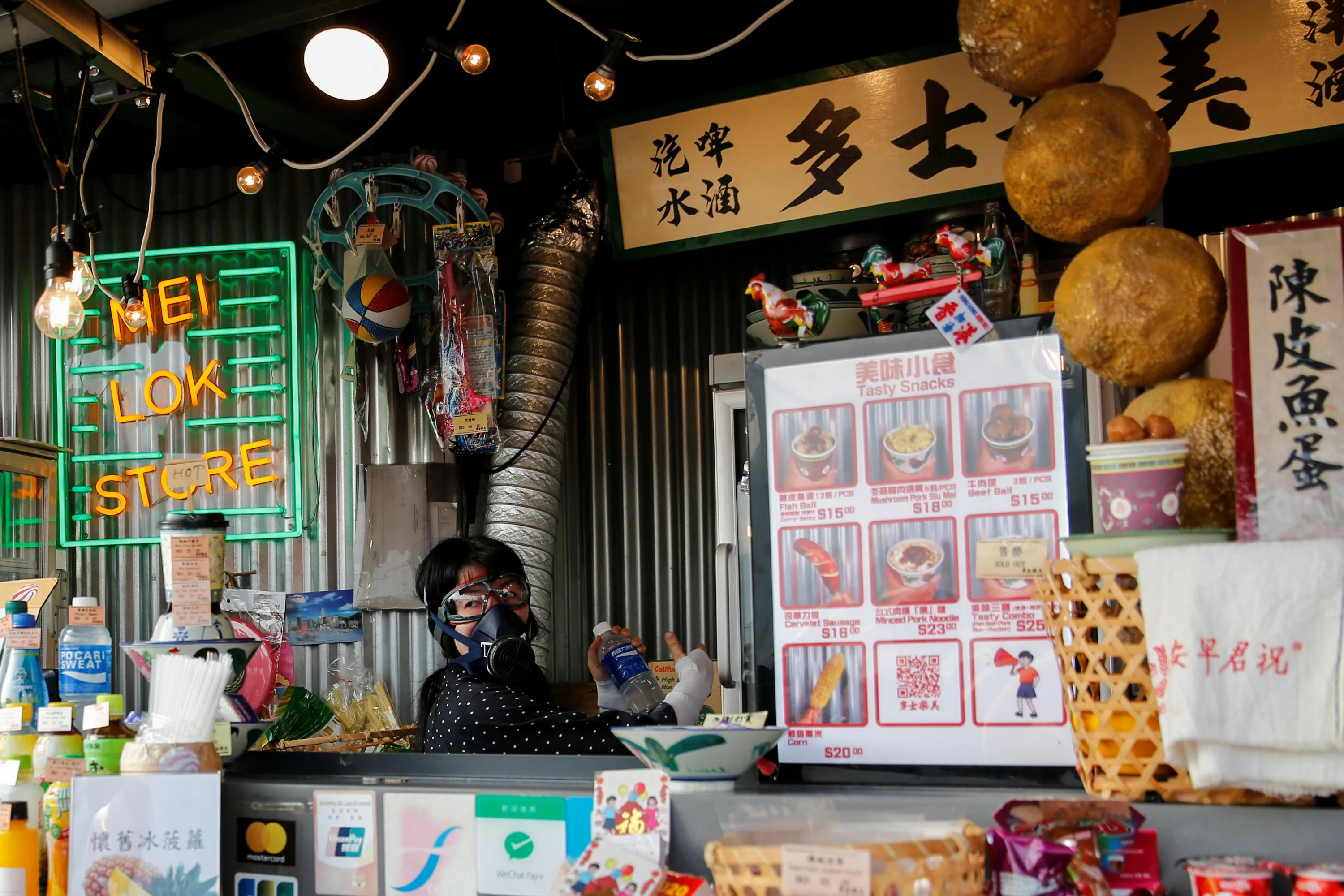 A storekeeper wears gas mask as she sells drinks for protesters while the riot police fire tear gas at Tsim Sha Tsui in Hong Kong, October 27, 2019. (Photo by Tyrone Siu/Reuters)
