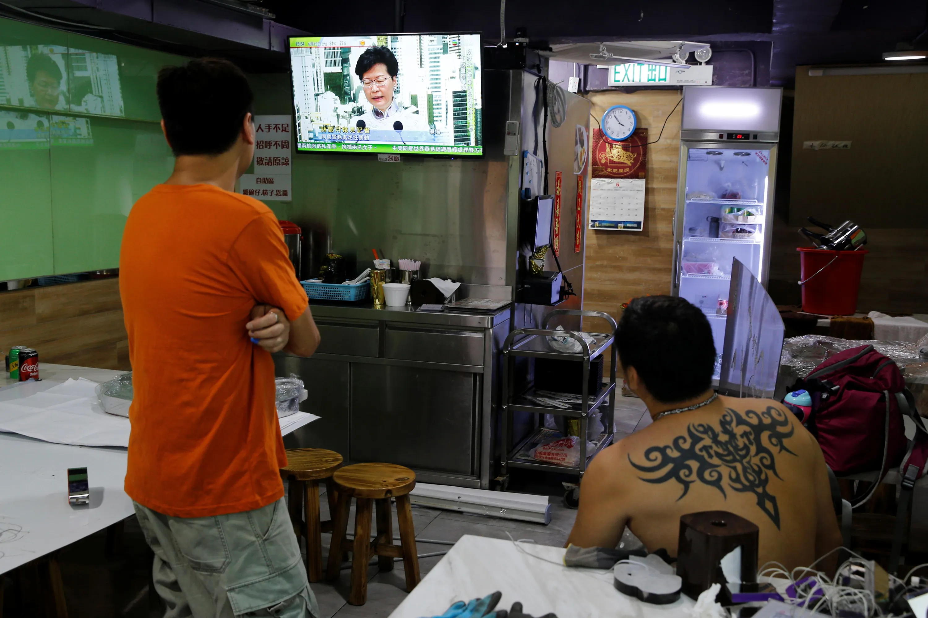 Men watch a TV broadcast of news conference of Hong Kong Chief Executive Carrie Lam inside a restaurant in Hong Kong, June 15, 2019. (Photo by Thomas Peter/Reuters)