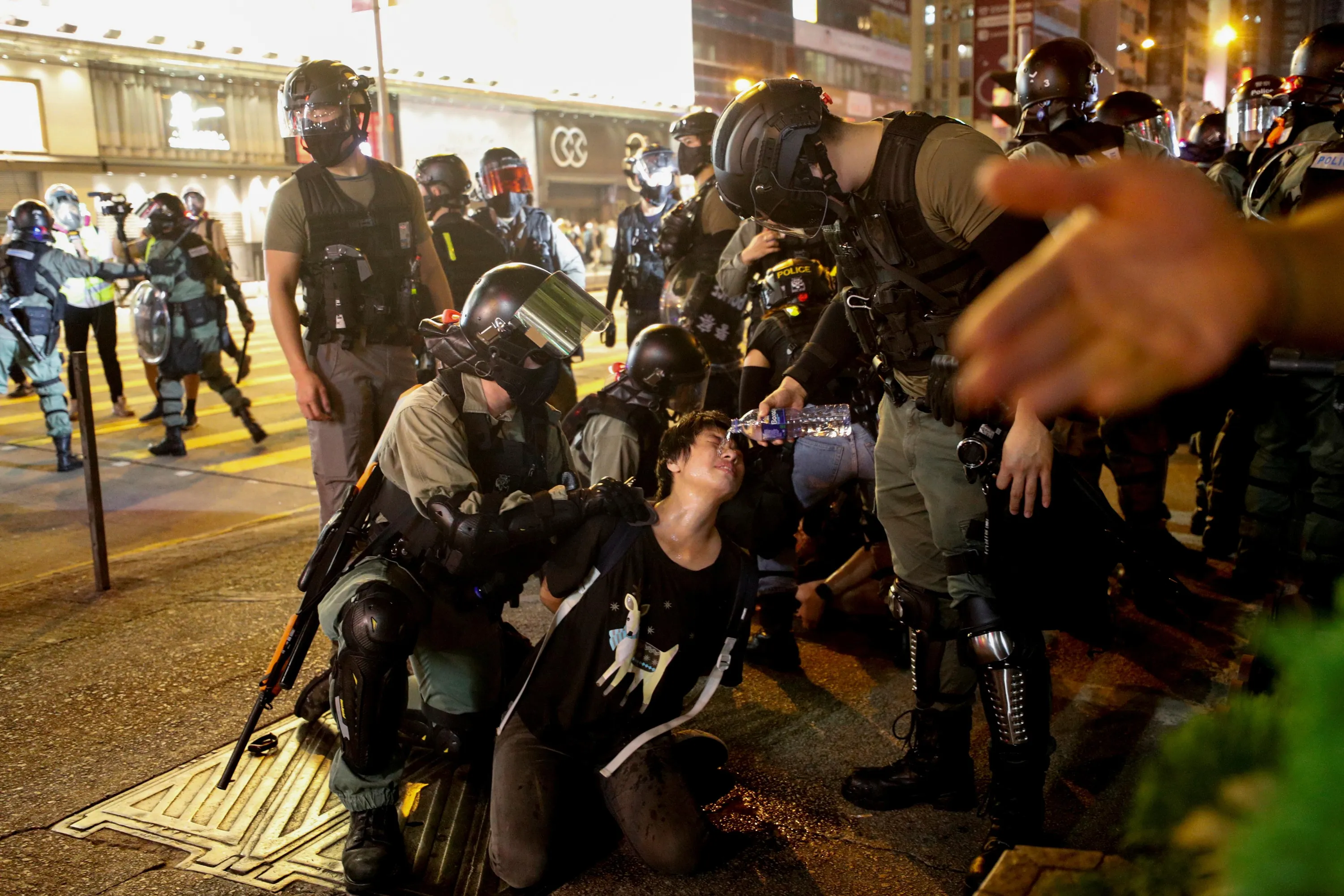 Riot police officers pour water over a pepper sprayed protester as he is detained during an anti-government protest in front of a police station in Mong Kok district, Hong Kong, China on October 7, 2019. (Photo by Jorge Silva/Reuters)