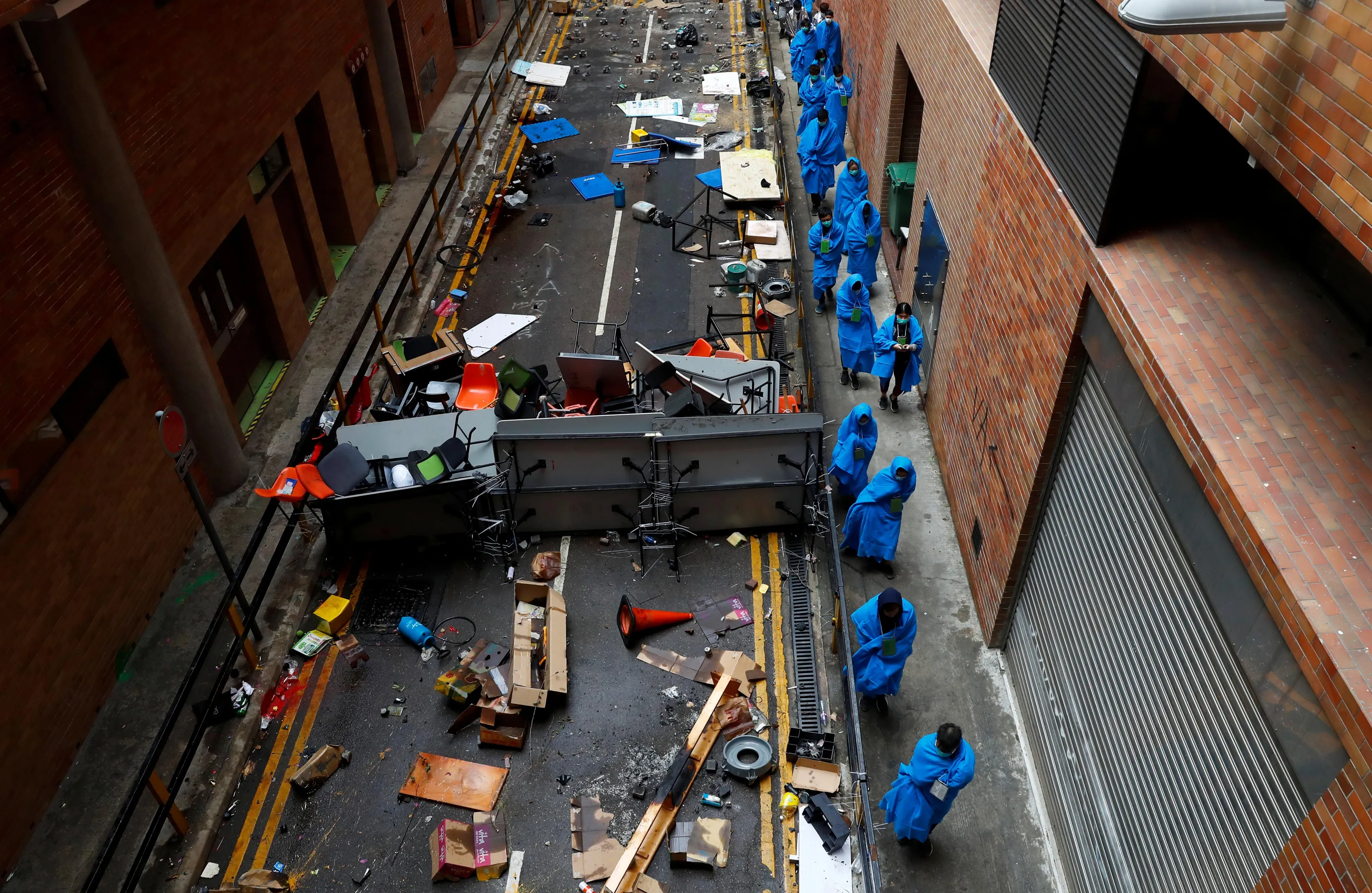 Protesters leave the Hong Kong Polytechnic University campus to surrender to police, in Hong Kong, China on November 19, 2019. (Photo by Thomas Peter/Reuters)