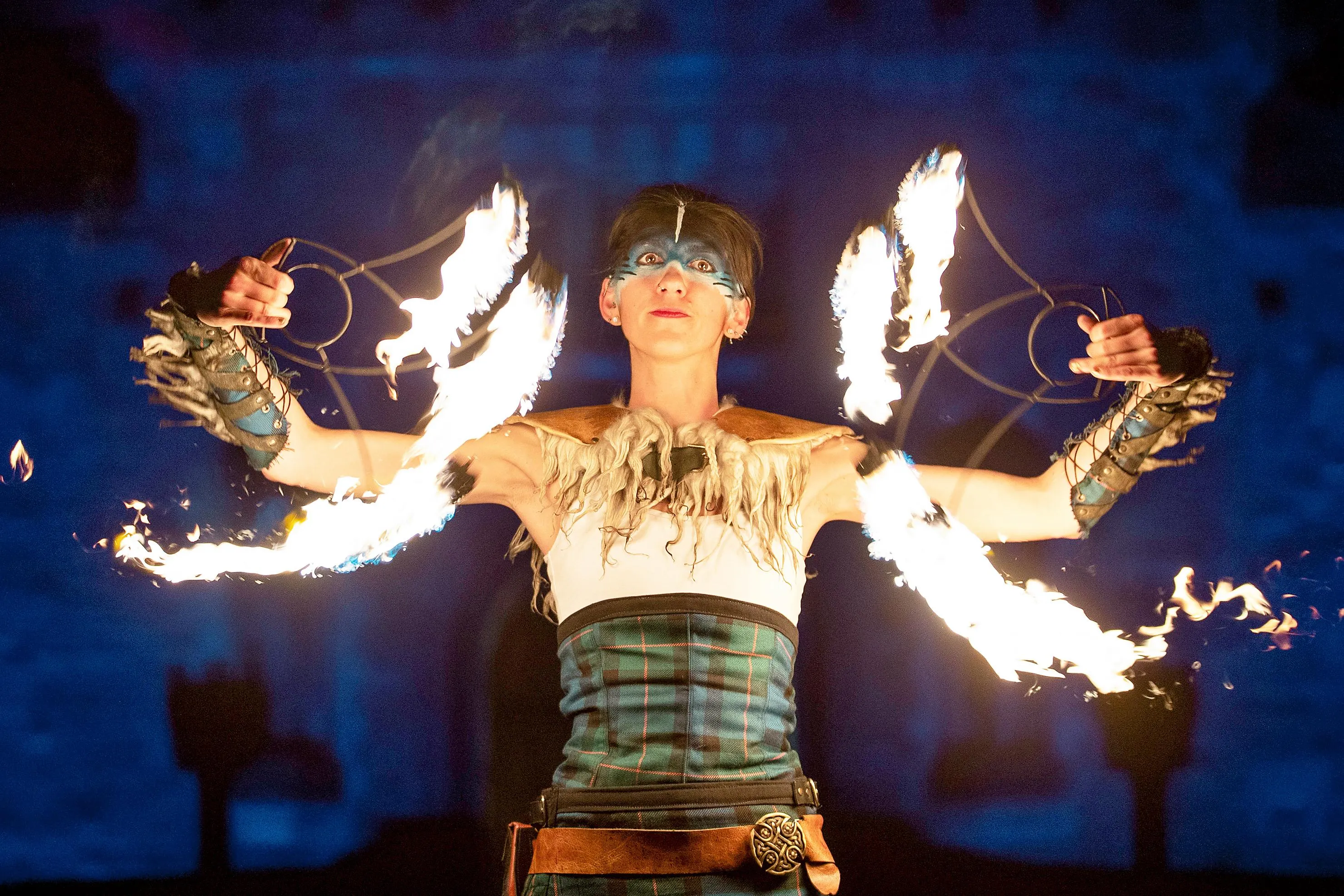The Celtic Fire Theatre company PyroCeltica perform in front of Edinburgh Castle Esplanade ahead of a torchlit procession down the Royal Mile during Edinburgh Hogmanay celebrations on December 30, 2019. (Photo by Jane Barlow/PA Images via Getty Images)