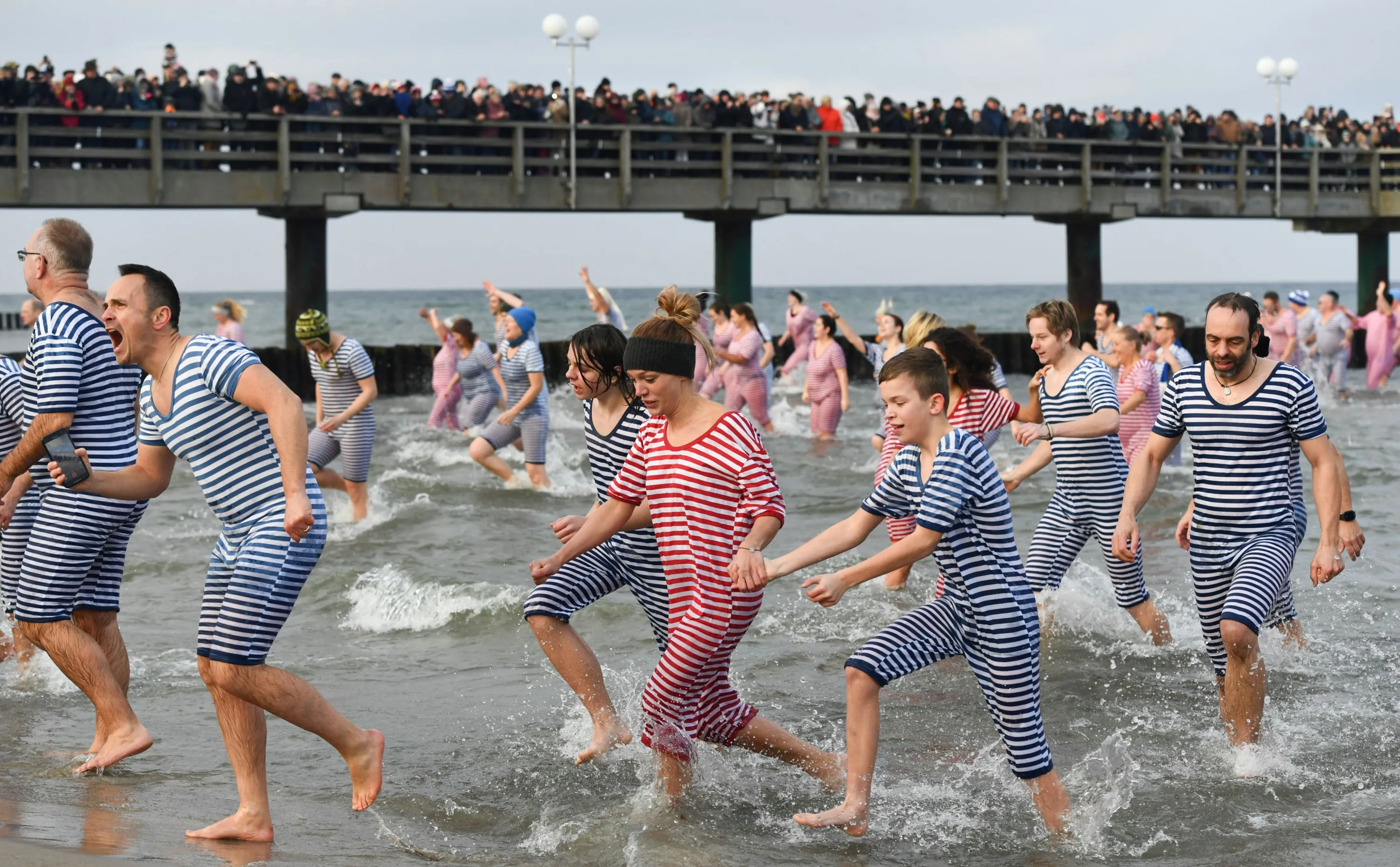 Winter swimmers leave the water after a dip in the Baltic Sea during the traditional New Year swimming in Kuehlungsborn, Germany, January 1, 2020. (Photo by Annegret Hilse/Reuters)