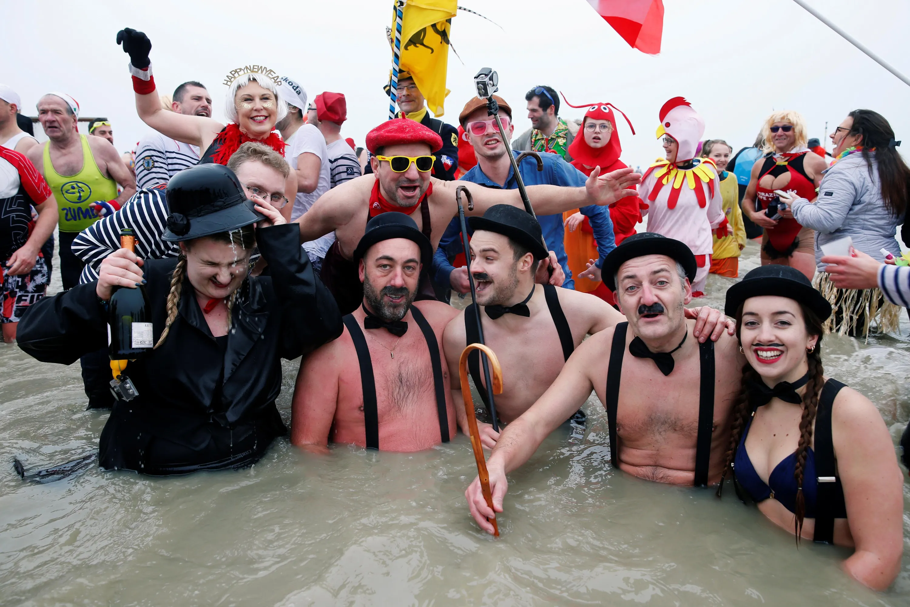 People wearing costumes participate in a traditional New Year's Day swim in Dunkirk, France on January 1, 2020. (Photo by Pascal Rossignol/Reuters)