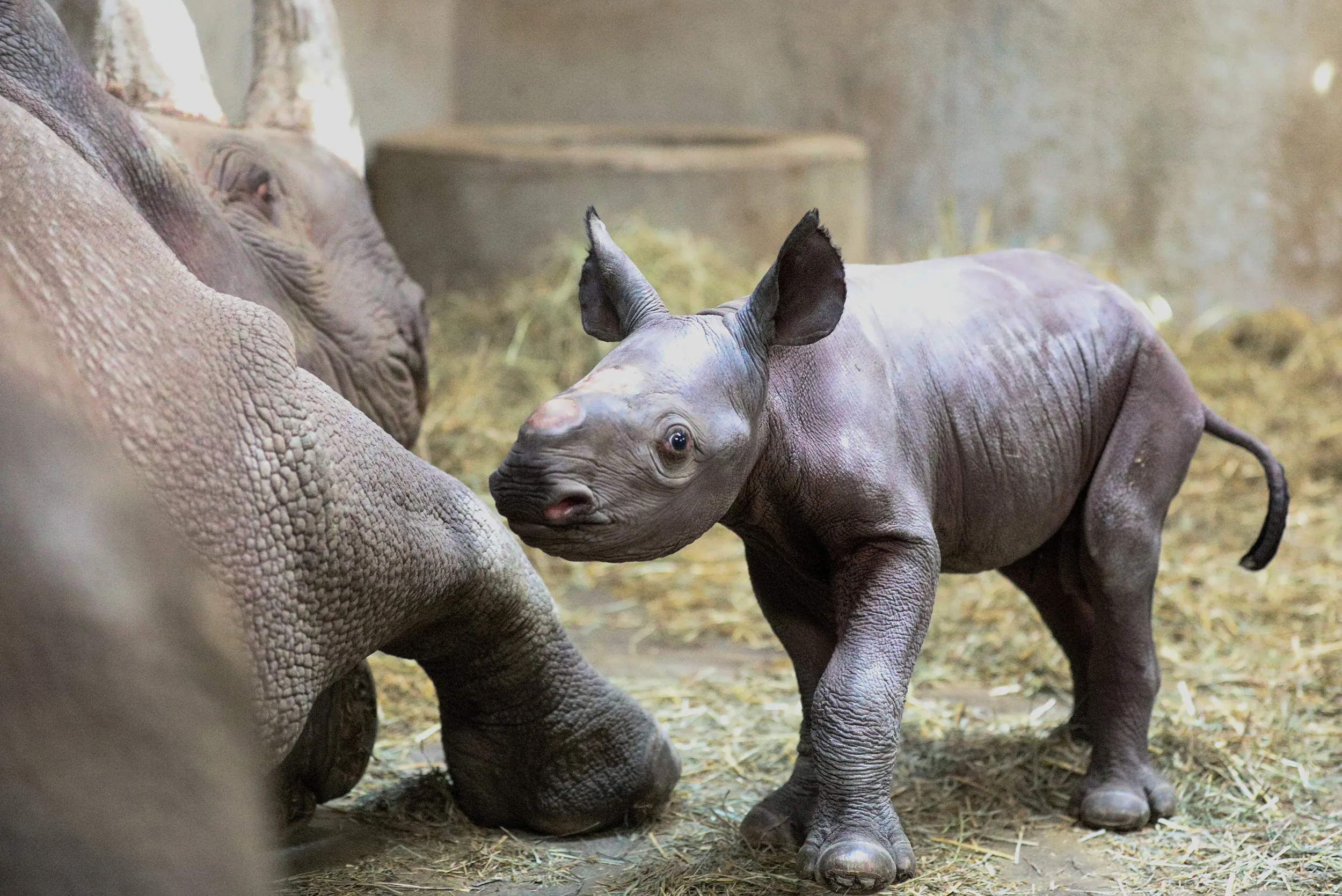 A male black rhino calf, which has not been named, is seen with his mother, Doppsee after its birth at the Potter Park Zoo in Lansing, Michigan, U.S., December 25, 2019, in this image courtesy of Potter Park Zoo. Picture taken December 25, 2019. (Photo by Kaiti Chritz/Potter Park Zoo/via Reuters)
