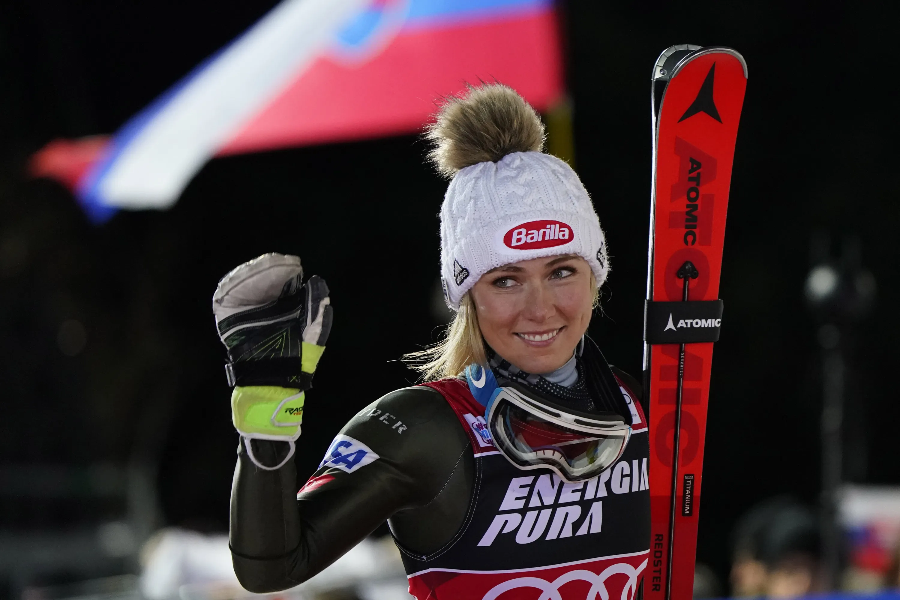 United States' Mikaela Shiffrin walks to the podium after taking second place in an alpine ski, women's World Cup slalom in Zagreb, Croatia, Saturday, January 4, 2020. (Photo by Giovanni Auletta/AP Photo)