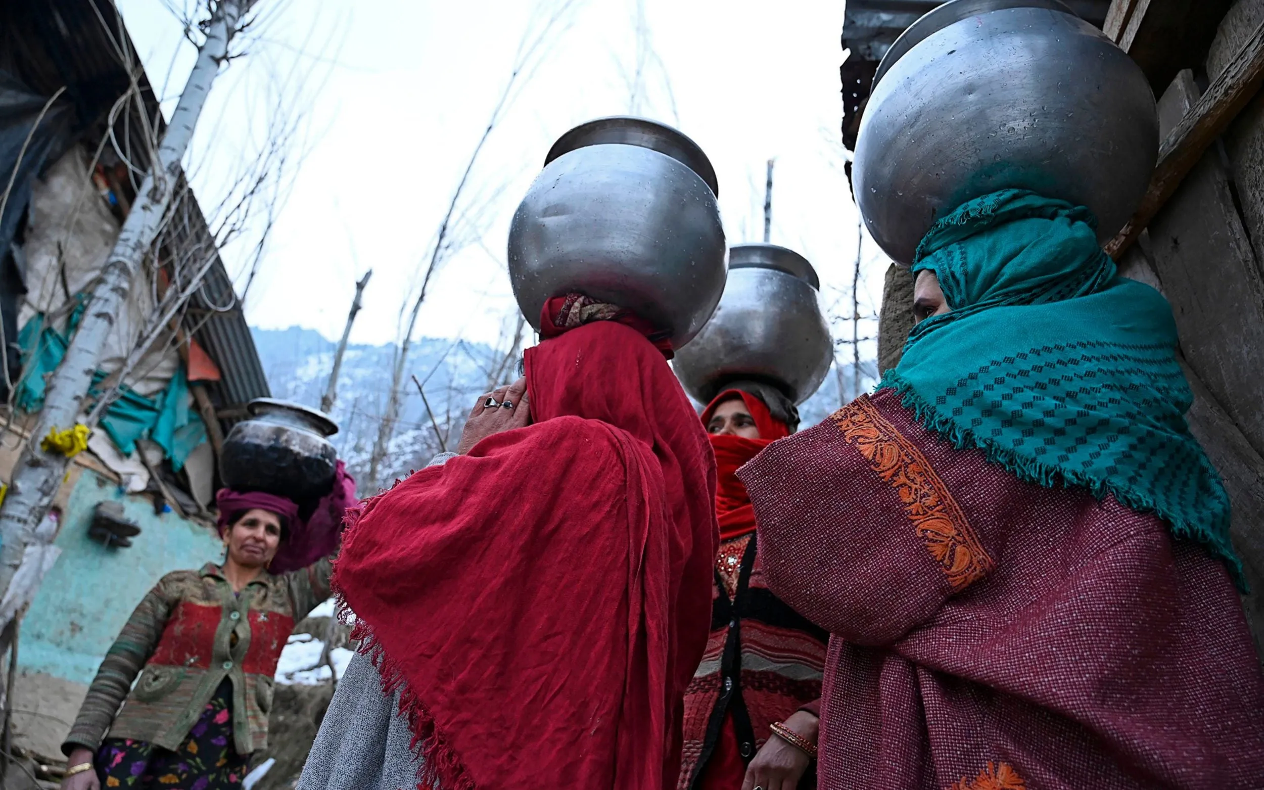 Women carry water pitchers on their head after a water pipe got frozen due to sub zero temperatures on the outskirts of Srinagar on January 3, 2020. (Photo by Tauseef Mustafa/AFP Photo)