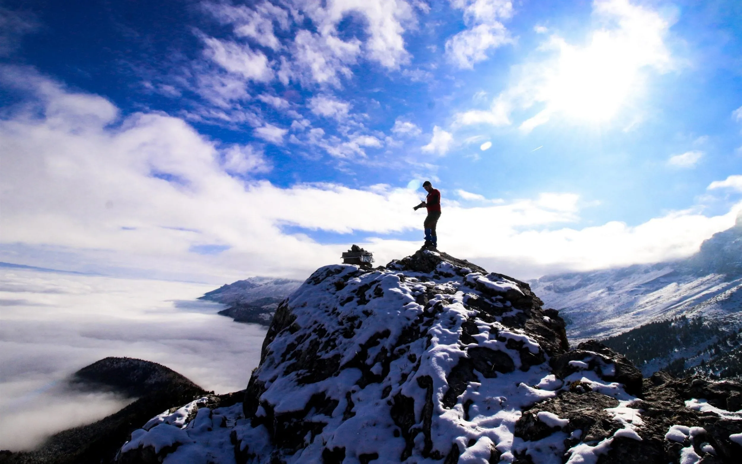 Trekkers look through fog as it covers landscape at Mount Kupe in Seydisehir district of Konya, Turkey on December 9, 2019. (Photo by Fahri Kubilay/Anadolu Agency via Getty Images)