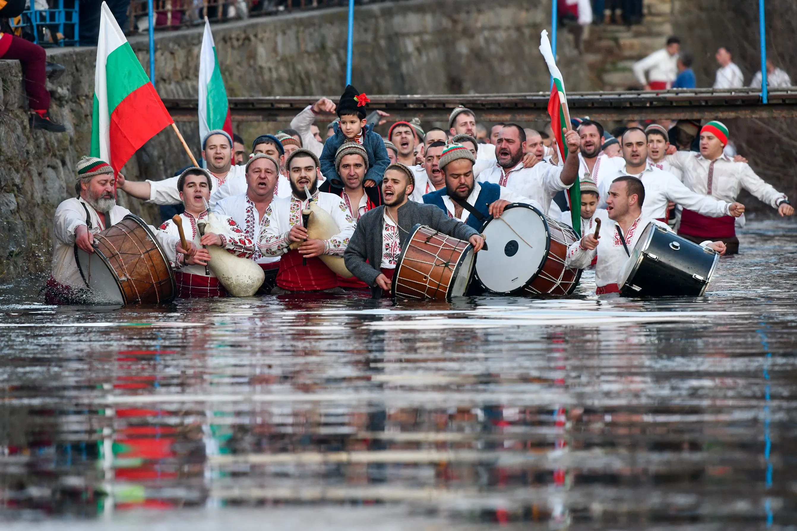 Bulgarian men perform the traditional “Horo” dance in the icy winter waters of the Tundzha river in the town of Kalofer, as part of Epiphany Day celebrations on January 6, 2020. As a tradition, an Eastern Orthodox priest throws a cross in the river and it is believed that the one who retreives it will be healthy throughout the year as well as all those who dance in the icy waters. (Photo by Nikolay Doychinov/AFP Photo)