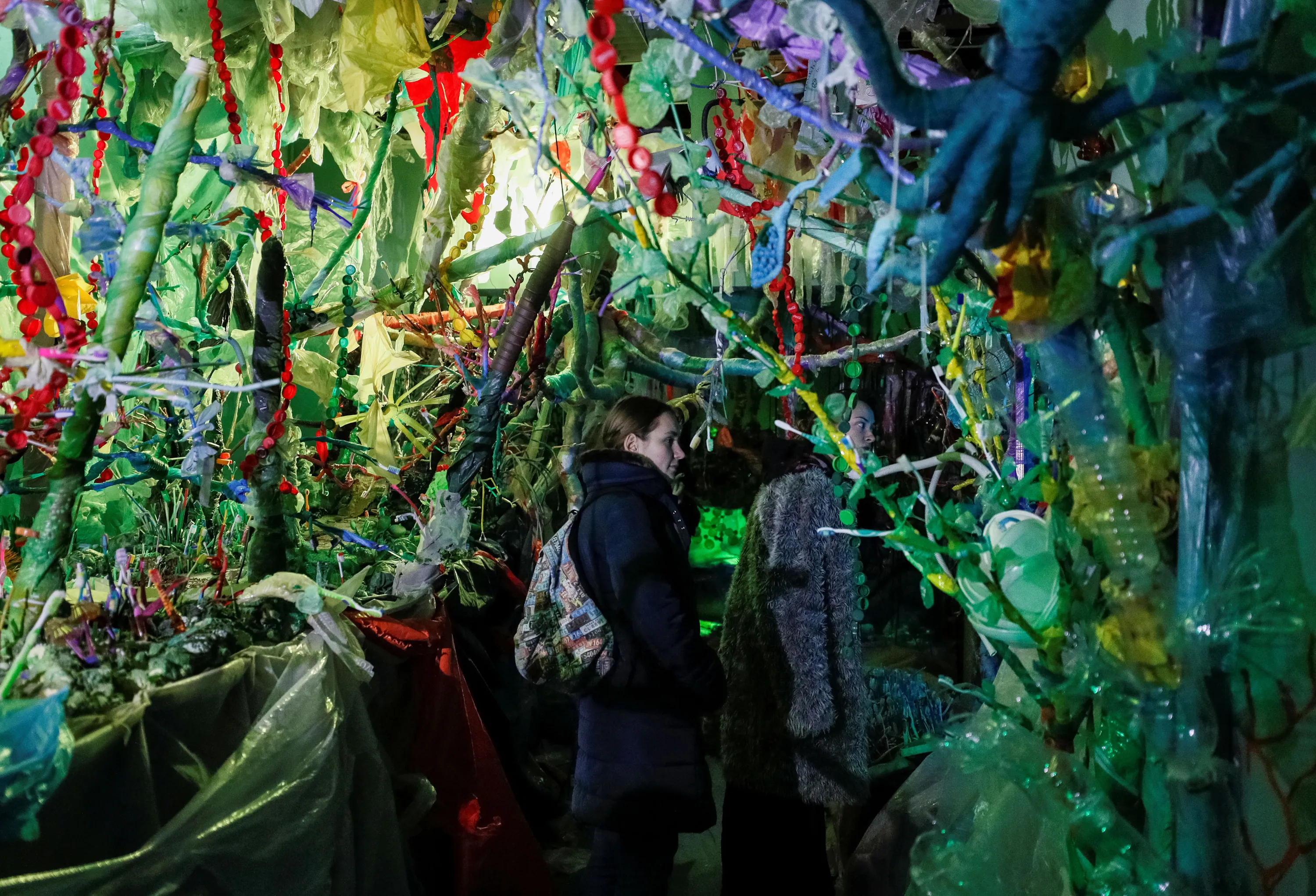 People attend an exhibition “Wrapped in plastic” in Kiev, Ukraine on November 26, 2019. Ukrainian director Vladi Yudi used plastic in various shapes and forms to create settings for a horror cartoon titled “Wrapped in plastic”, with main character Garbie, combination of Barbie and garbage. Cartoon decorations were embedded into a bigger same-name exhibition fully made of recyclable and non-recyclable waste. (Photo by Gleb Garanich/Reuters)