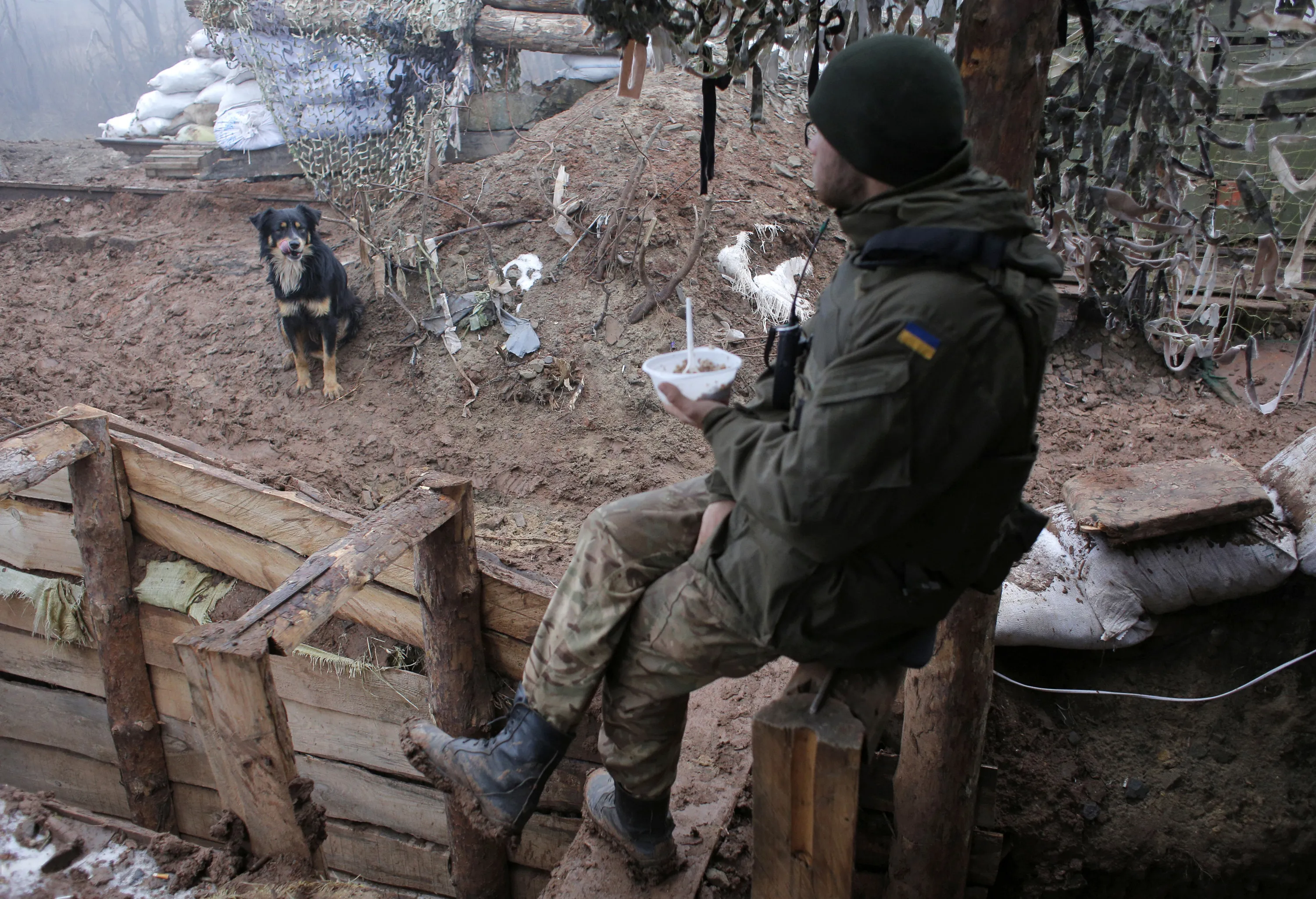 A Ukrainian soldier eats in a trench in the front line near the town of Novoluhanske in the Donetsk region, Ukraine, Monday, December 9, 2019. A long-awaited summit in Paris on Monday aims to find a way to end the war in eastern Ukraine, a conflict that after five years and 14,000 lives lost has emboldened the Kremlin and reshaped European geopolitics. (Photo by Vitali Komar/AP Photo)