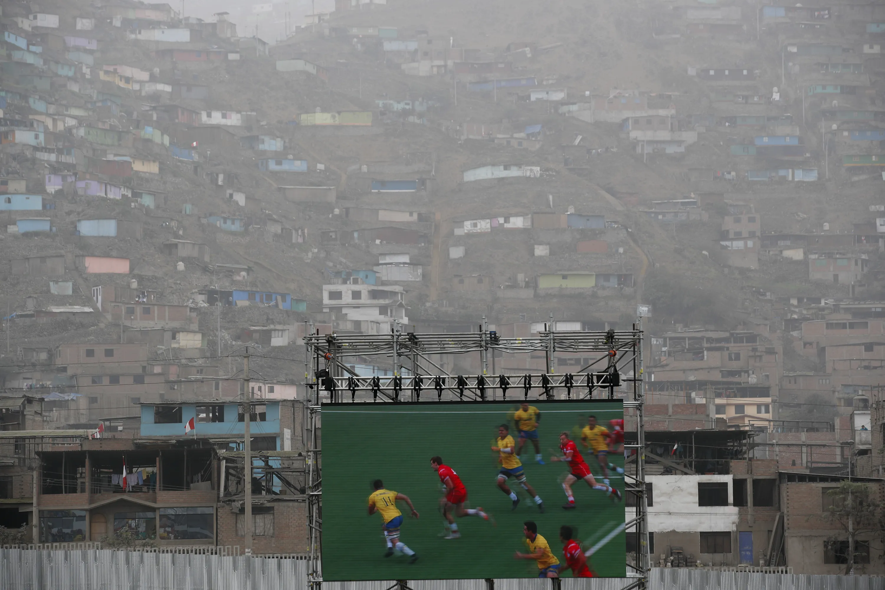 A screen shows action replay of a rugby seven match between Canada and Brazil during the Pan American Games inside a stadium where homes can be seen on the hillside behind in Lima, Peru, Sunday, July 28, 2019. (Photo by Moises Castillo/AP Photo)