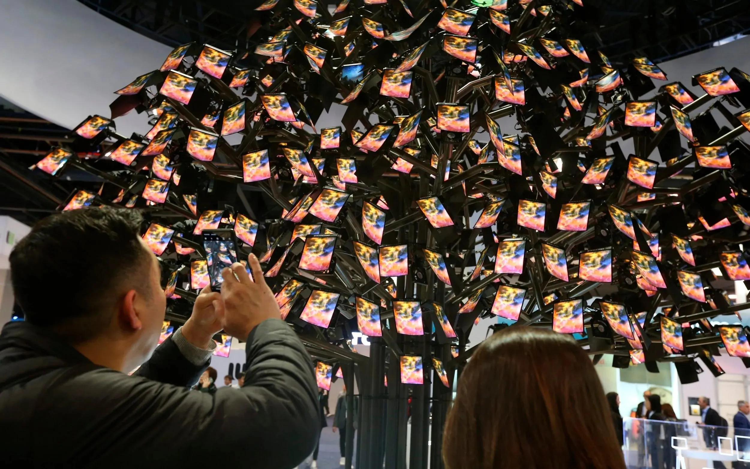 atrons take photos of Royole's fully flexible display and sensor technologies in an artistic tree decorated with some 1,000 screens of fully flexible displays during the CES tech show Wednesday, January 8, 2020, in Las Vegas. (Photo by Ross D. Franklin/AP Photo)