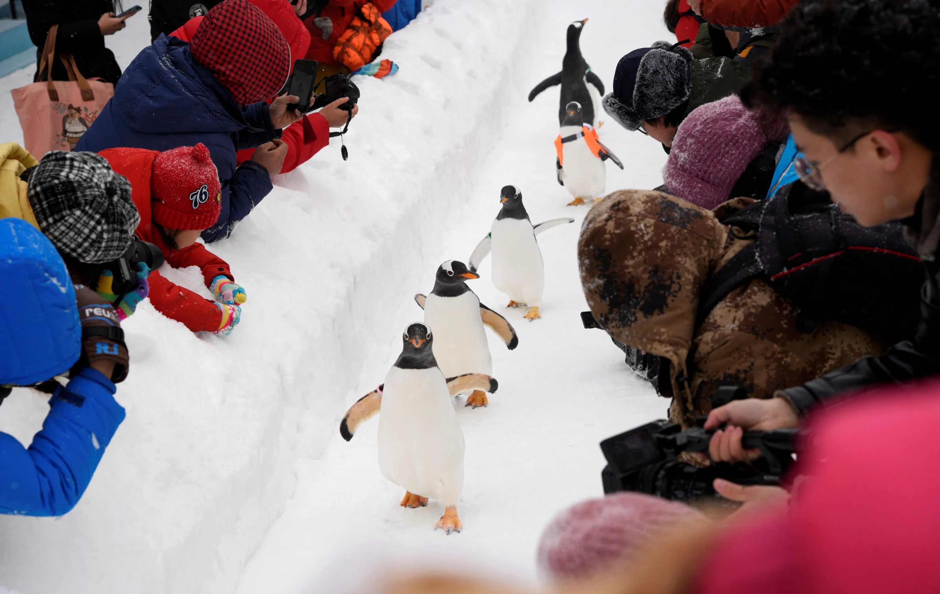 Penguins, that are brought to an outdoor area for an event, walk on snow during the Harbin International Ice and Snow Sculpture Festival, near the Harbin Polarland aquarium in Heilongjiang province, China on January 7, 2020. (Photo by China Daily via Reuters)